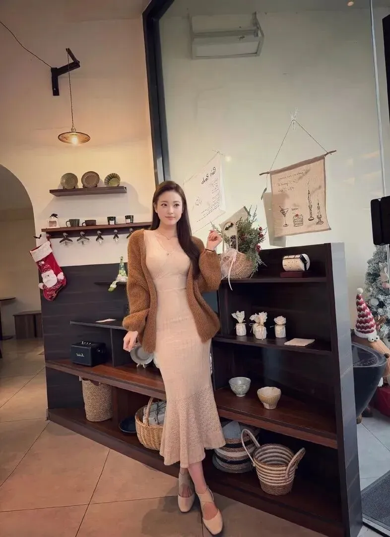 想要变温柔的小姐姐吗?她有套针织穿搭的绝学。浅米色针织连衣裙修身剪裁既雅致又大方,鱼尾裙摆走路的时候摆得自然,女魅力一目了然。