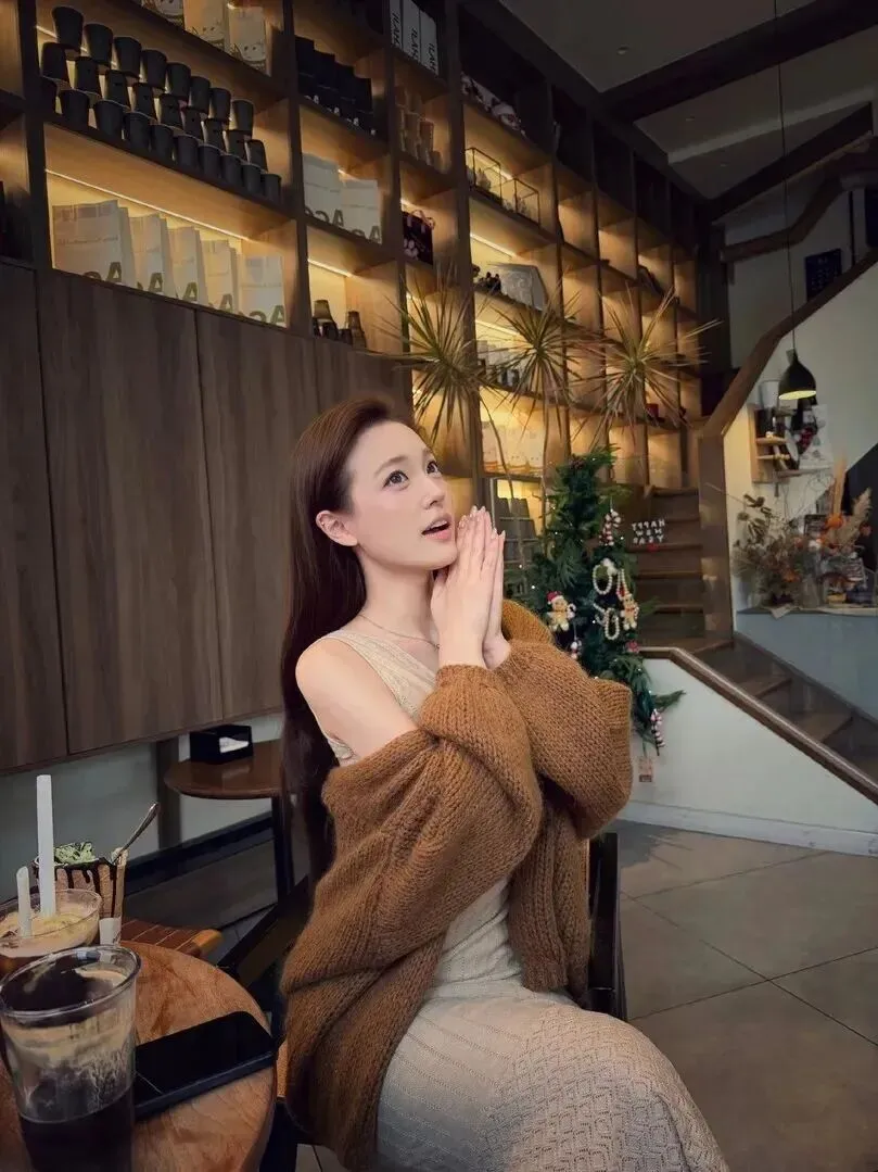 外面套件宽松的棕色针织开衫,保暖且软糯,坐在咖啡馆里跟圣诞装饰合影,整个人都融进温暖的氛围里。