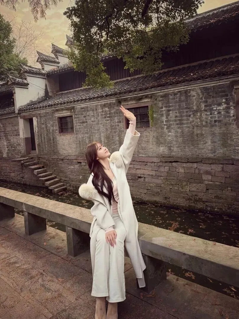 到了江南水乡,她笔下的画风就立刻变成了一种古典的写意。米白色的长款毛绒大衣,领口、袖口处绣有毛球,十分可爱地像是童话里公主的装束。