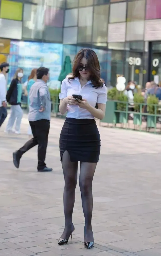 再说说裙子。很多人怕包臀裙太紧或者太正式,其实选对了版型就很好穿。她这条是高腰设计,一下子就把腿拉长了。腰臀比例显得特别好,整个人看起来特别挺拔。