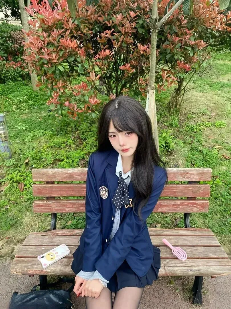 最为吸引人之处是,笑起来的眼睛弯弯的,长椅上摆放的是带有卡通图案的小玩具、粉红梳子、黑包包。JK制服同这些东西搭配起来没有冲突的感觉。制服不只是在学校里穿的服装,也可以装下一个生活里所有的可爱之处。