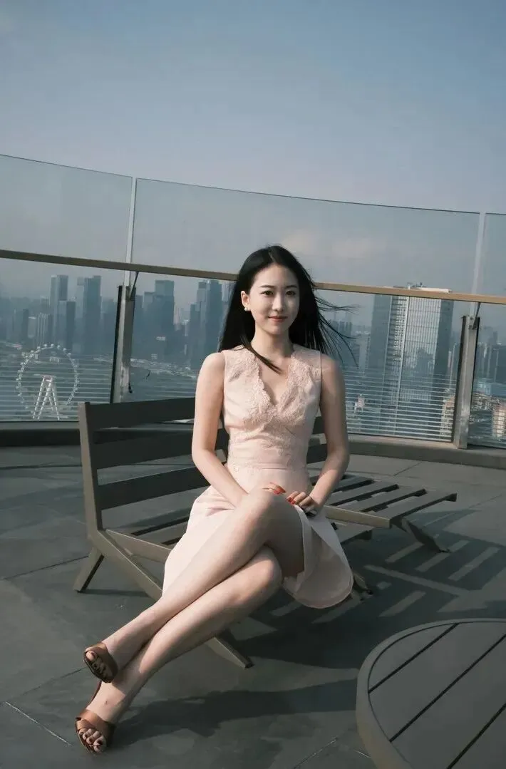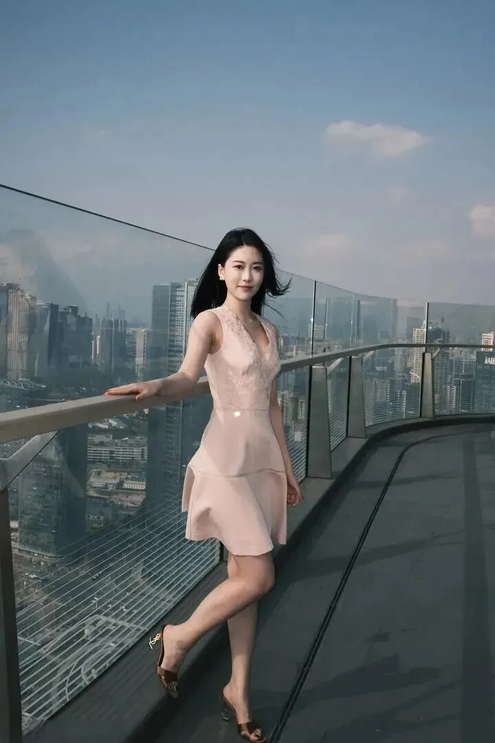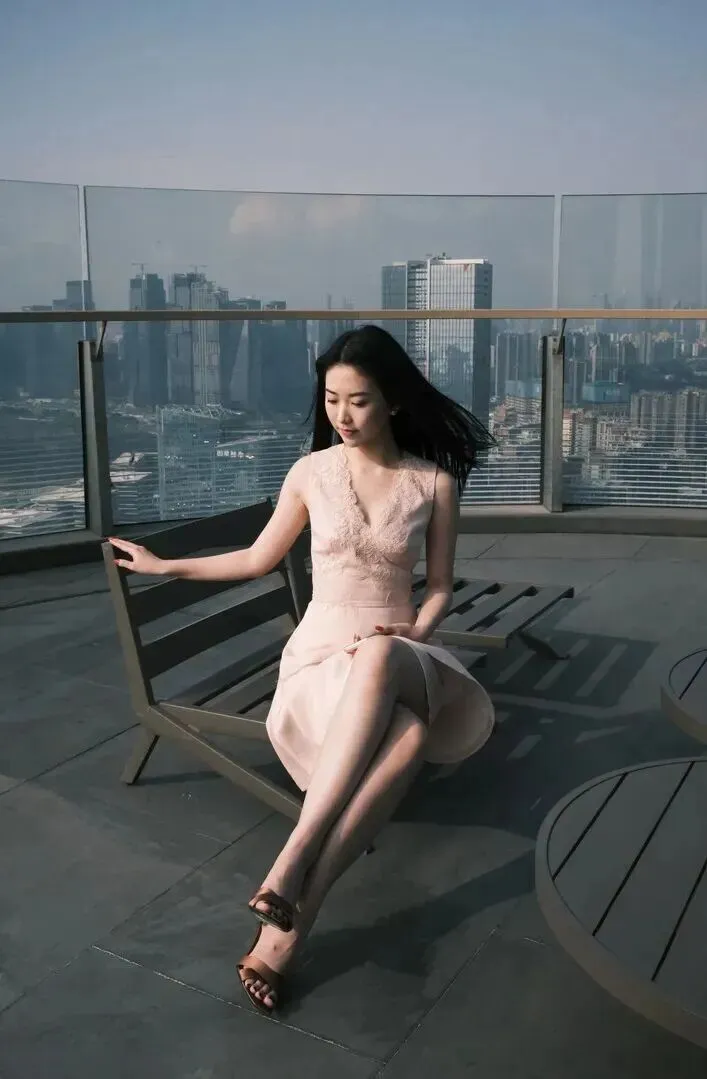 站在高高的观景台上,女孩会飞起来一样。裙子上缀满了轻纱,风吹动了上面细碎的花纹,身体呈现出一种曲线的感觉,腰部被描成细长的样子,棕色凉鞋里镶嵌着金边。她低头望着镜头眼神里蕴含了对青春岁月的依恋讲述着自己那年轻时的故事。是开阔的城市风景,使她既小又灵。