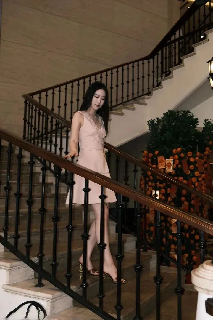 进入室内,女孩正从楼梯上下来。浅粉色裙子把她白皙的肌肤完美地呈现了出来,胸前的米白色蕾丝花纹虽然很精致但是有一定的层次。A 字裙摆使身体线条更加优美,脚上那双金黄的高跟凉鞋好似一枝柔韧多姿的绿萝,在色彩对比之下熠熠生辉。楼梯边放着一盆年桔树,黄澄澄的橘子、小红包让其多了几分喜庆之气,却也更显得甜美起来。