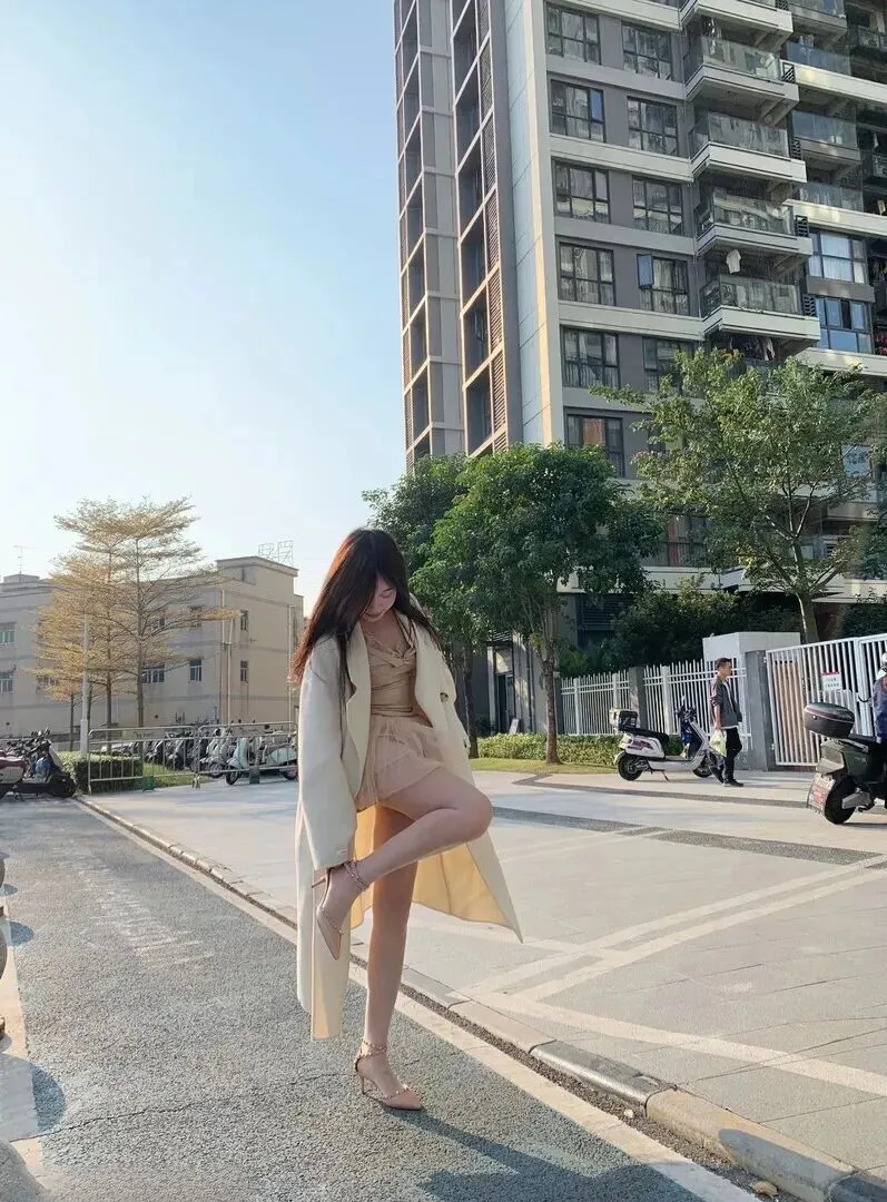 长款风衣是上班必穿的。腰带随意系上,走路带风的气场就出来了。里面穿米色针织连衣裙,脚下是裸色高跟鞋,在小区门口拍张照片,同事都忍不住多看两眼。