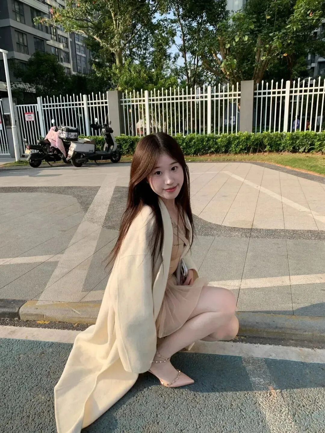 先从温柔到骨子里这个组合开始。一件浅米色的针织开衫,搭配同色系的吊带裙,外套再加一件奶白色的西装外套。裙摆若隐若现的蕾丝花边与脚下的编织鞋相互呼应。穿法特别显高,小个子女生也能够穿得过去。坐在小区长椅上随手一拍就是大片。
