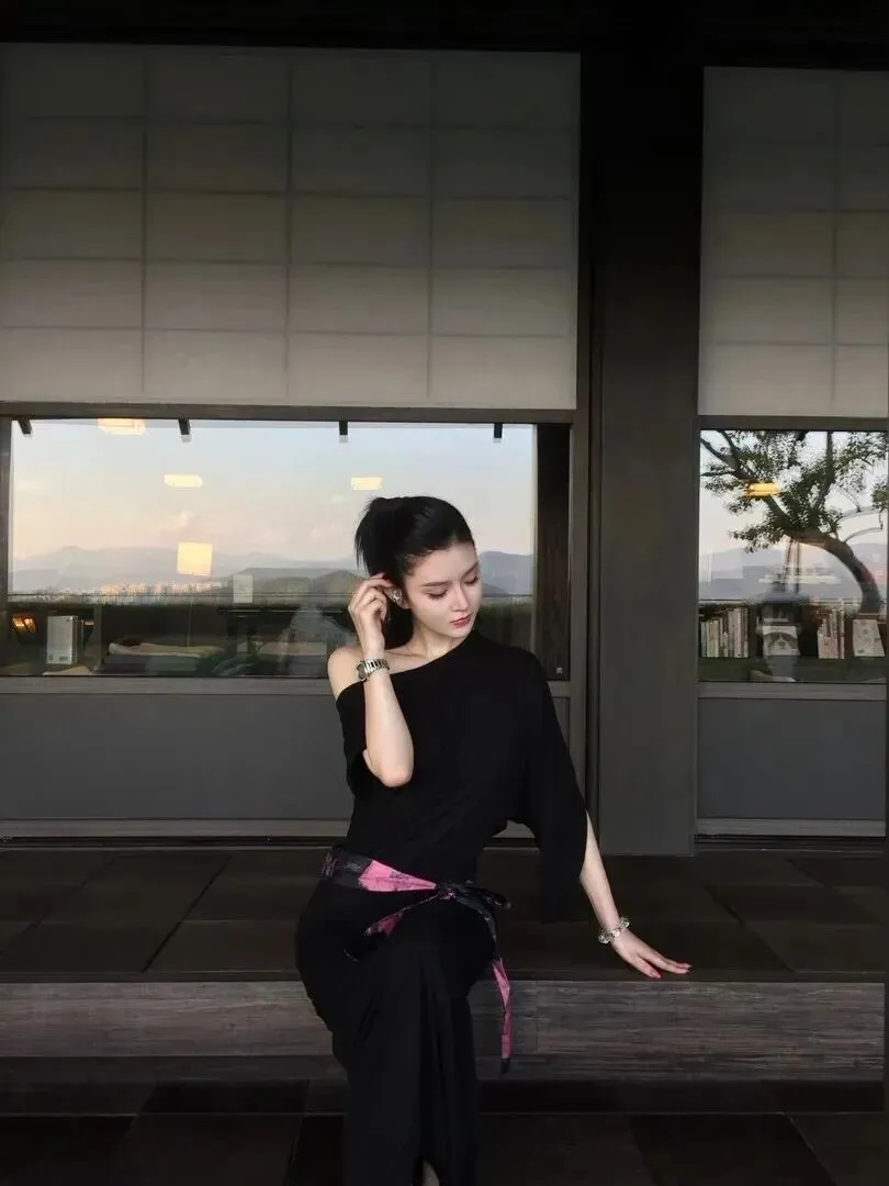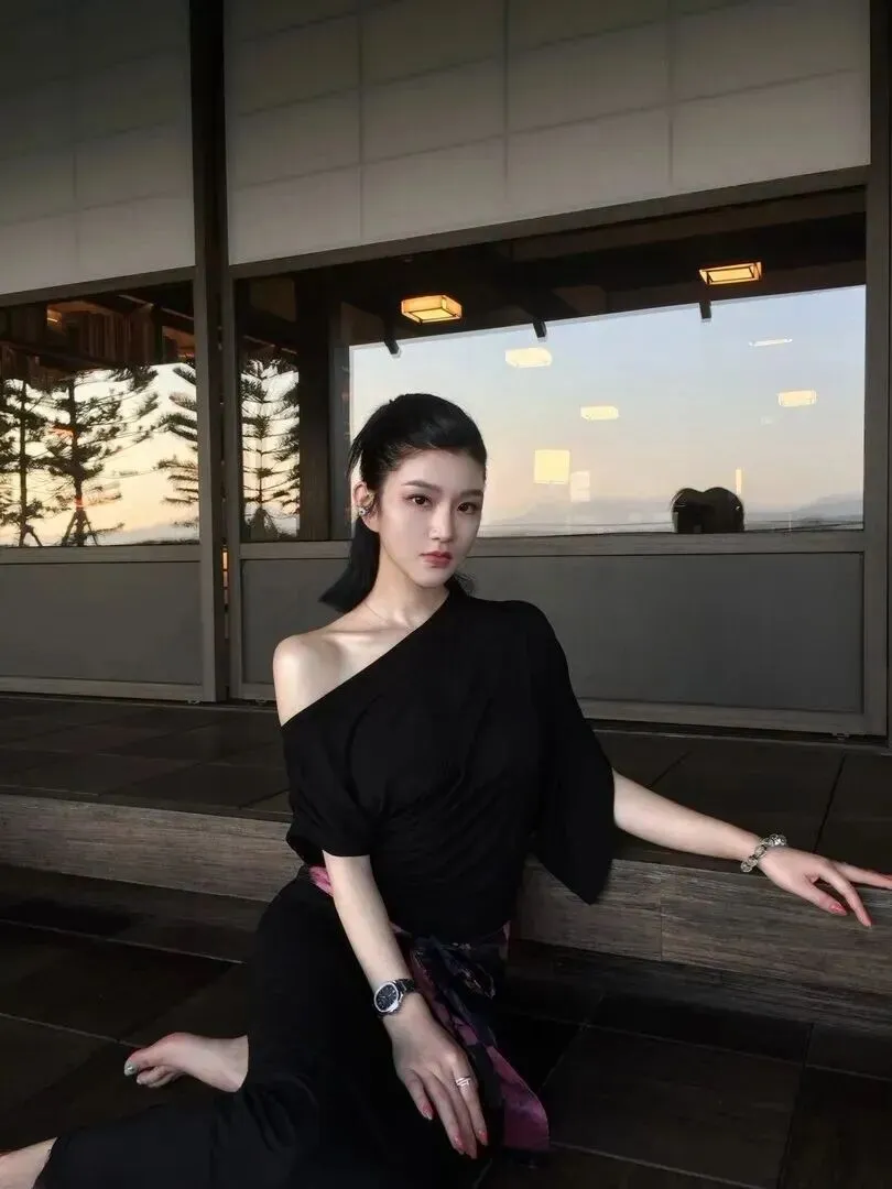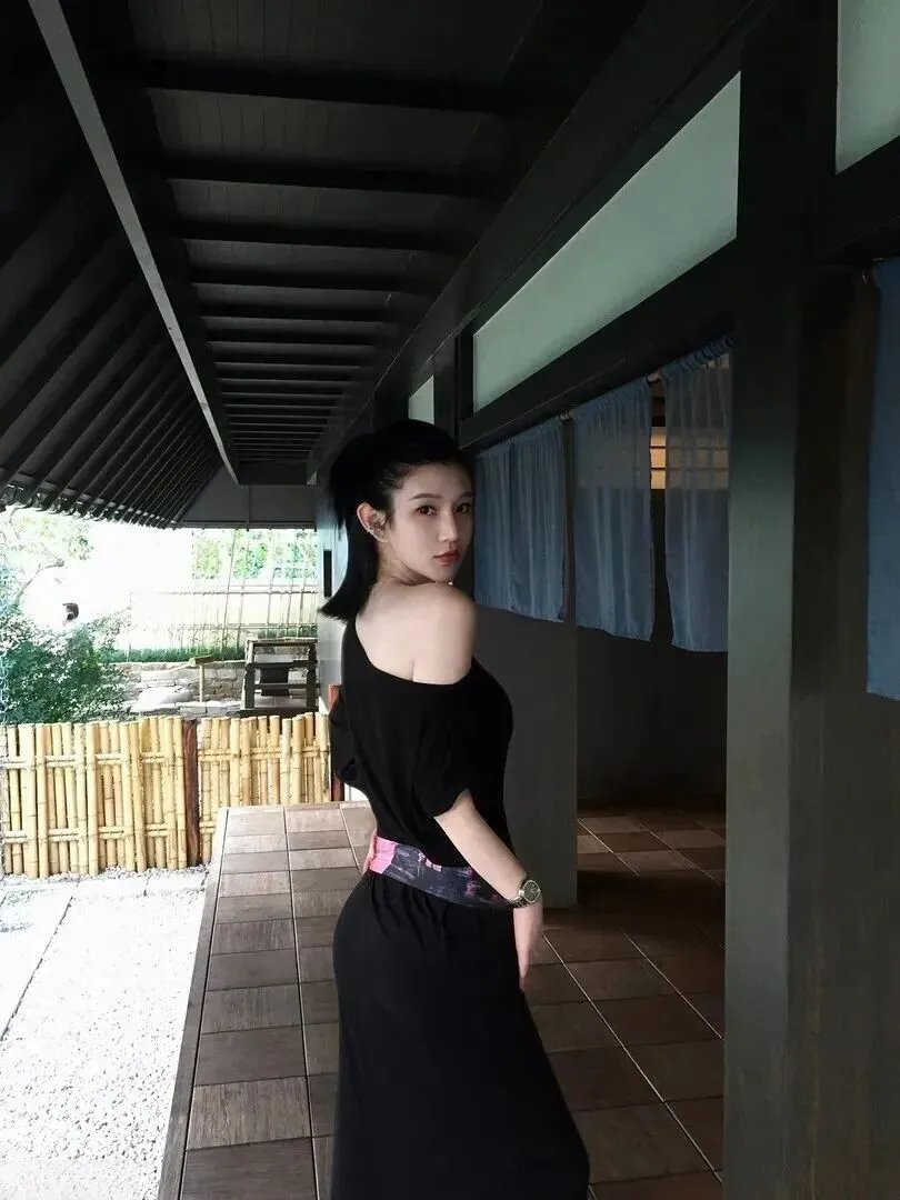 最后套出这样一款露肩针织连衣裙,黑色温柔被彻底释放了出来。柔软的针织面料接近人体曲线,穿着比较舒服。略带肩颈线条却依然端庄,不是过分突出。腰带依旧保持原来的粉紫色晕染设计,但是与针织面料相结合之后,就更加显出女人味了。美女转头一瞬间搭配上日式廊道背景之后,优雅的气质便散发出来,是款约会神器的裙装,在高跟鞋中便是一位端庄大姐姐,无人不被惊艳到。