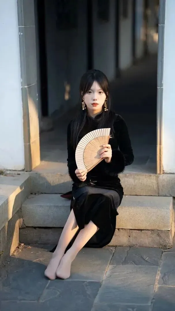 如果你想尝试复古旗袍穿搭的话,就按照小姐姐的思路去试试看。选择黑丝绒旗袍,金耳环或者金项链,折扇一柄。拍照时选择中式庭院或老巷子为背景,在光线柔和的午后拍效果最好。摆动优雅的姿势,轻盈的走几步,静坐片刻都可使整身显得有血有肉。