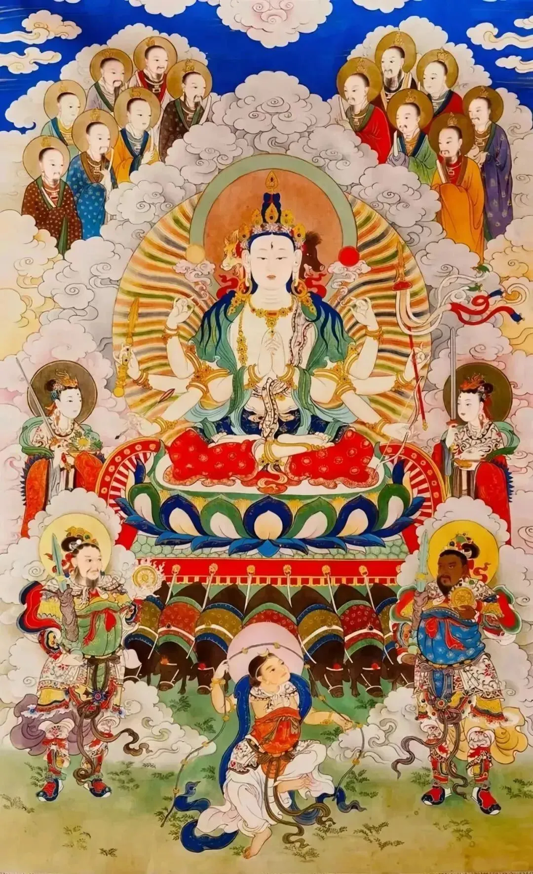 慈航道人,又称观音大士。大士为妙庄王三公主,自幼好道,王为择婿不从。王命斩之,刀寻段段坏,后于香山修道成仙。王有病之时,大士以眼手为药引,救活了父亲。大士孝感动上天,上天以一偿十,现千手千眼灵感观世音宝相。大士大慈大悲,救苦救难,广大灵感,无刹不现身。
