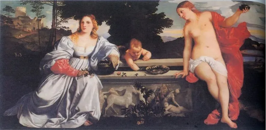 真正标志着他个人风格成熟的,就这这幅有名的《神圣与世俗之爱》。这幅画像是一场视觉辩论:左边衣着端庄的“神圣之爱”,与右边光彩照人的裸体“世俗之爱”,分别倚靠在古典石棺两侧,背景的山峦城堡与湖滨城镇也遥相呼应。