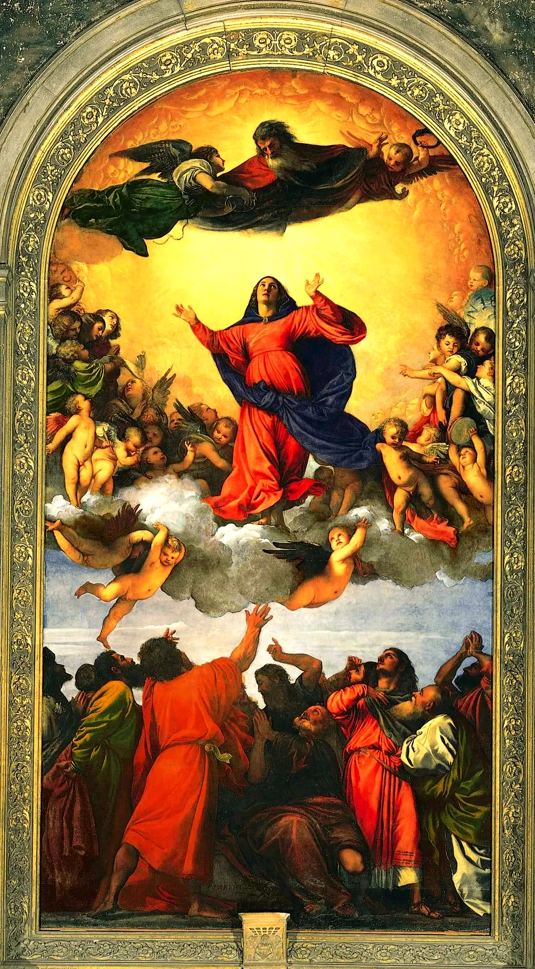 1516-1518年,提香为威尼斯弗拉里教堂绘制的巨作《圣母升天》,他也因此一举成名。这幅近七米高的祭坛画,打破了传统圣母像的宁静格局。圣母凌空而起(如同传统绘画中基督的形象),地上的圣徒们激动万分,天上的圣父在光环中显现,整个画面充满了动感和戏剧性。当时的人们惊呼其为“近代第一杰作”。
