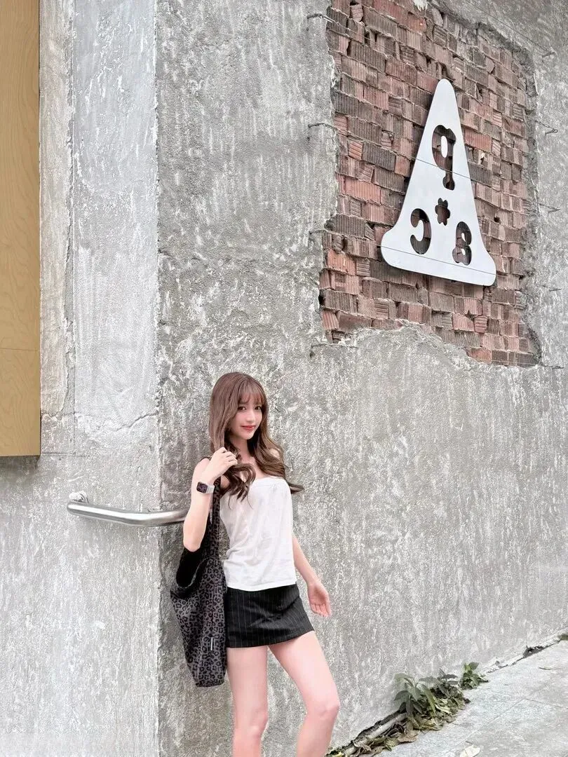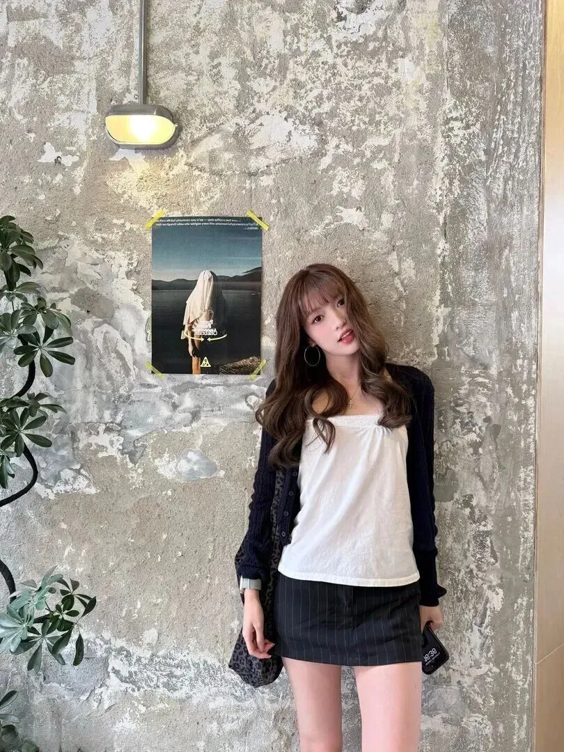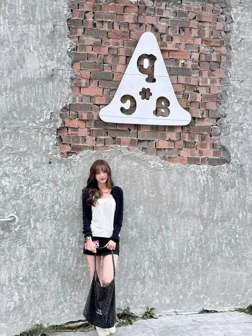 全身照呈现她良好的比例。黑色修身短裙会使腿看起来更细长。米白色鞋子配小袜子,可爱的加分项。一手拿着粉色的手机,一手提着彩色的皮包,在生活的细节里都可以体现出现有人生的情趣。