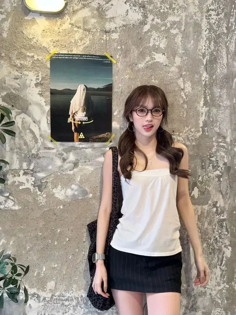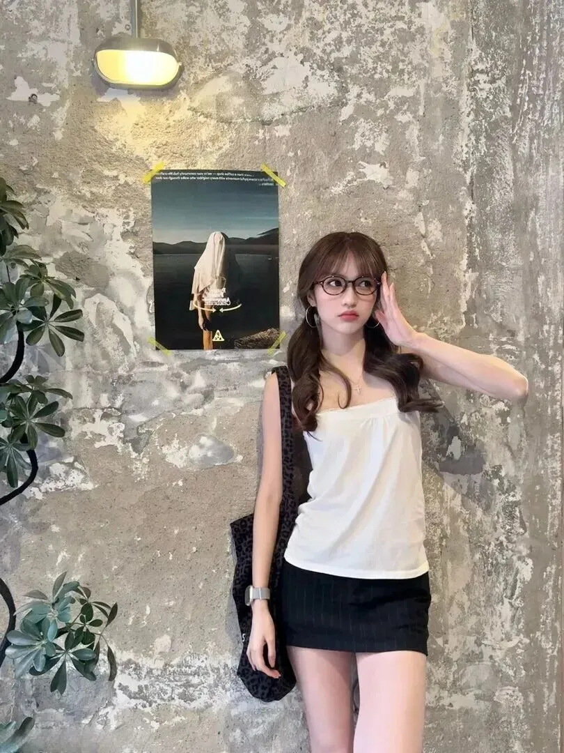 她回转身笑了起来,甜甜的叫人心动。米白色的吊带衫搭配黑色竖条纹短裙从没让我们感到失望过。戴上细框眼镜之后,她就从一个邻家女孩变成了一个复古女郎,有着十分到位的文艺气质。