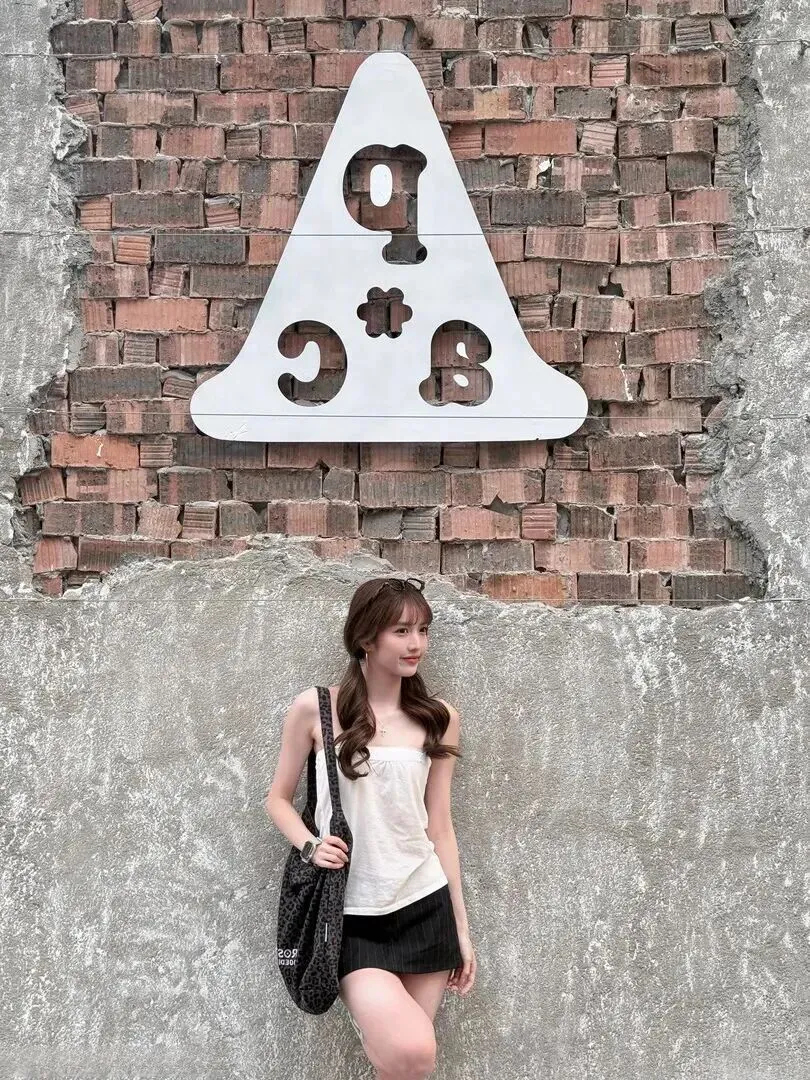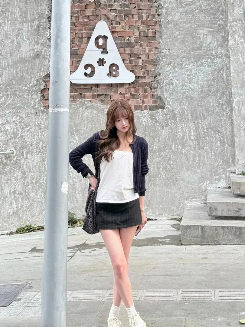 第一眼就被她吸引了。浅棕色的大波浪卷发配上空气刘海,整个人都是柔美的同时保留着一些灵气的感觉。她站在水泥墙上很放松。白色的吊带连衣裙配一件青色针织开衫,素雅但是有特别的味道。随意感是高审美的一种。