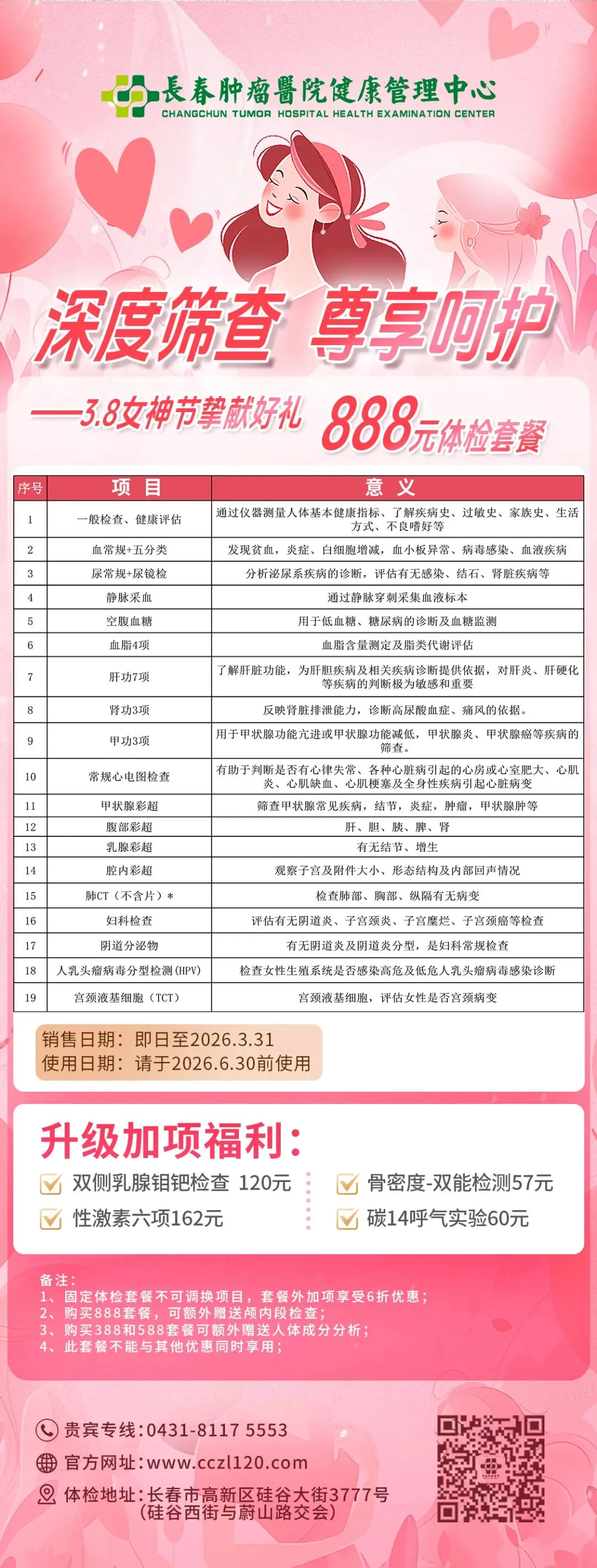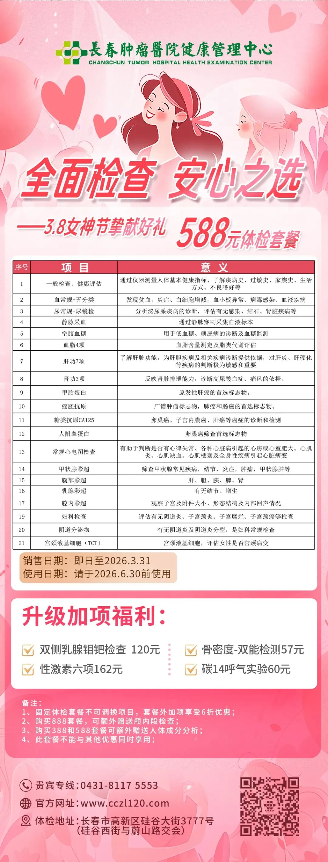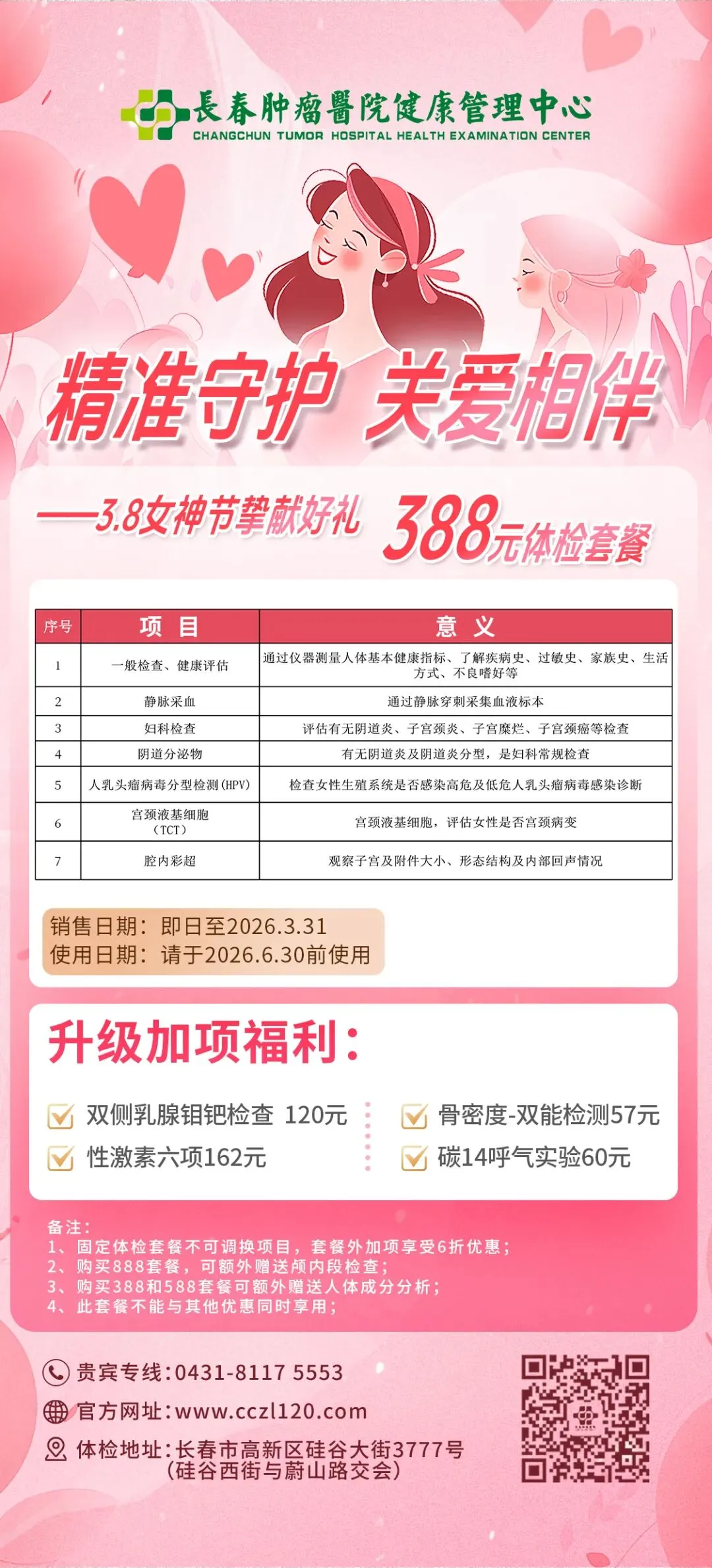 长春肿瘤医院健康管理中心深知你的付出与珍贵,在 3・8 女神节之际,为你精心准备了三款专属体检套餐 —— 从基础守护到全面筛查,每一份都藏着对健康的细致关怀,让你在温柔的春日里,为自己的身体做一次全面 “年检”,把安心与底气握在手中。