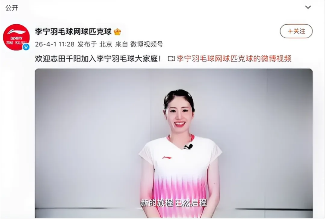 4月1日,日本羽毛球人气名将志田千阳在个人社媒官宣签约李宁,并用中文向球迷致谢,宣告新征程开启。