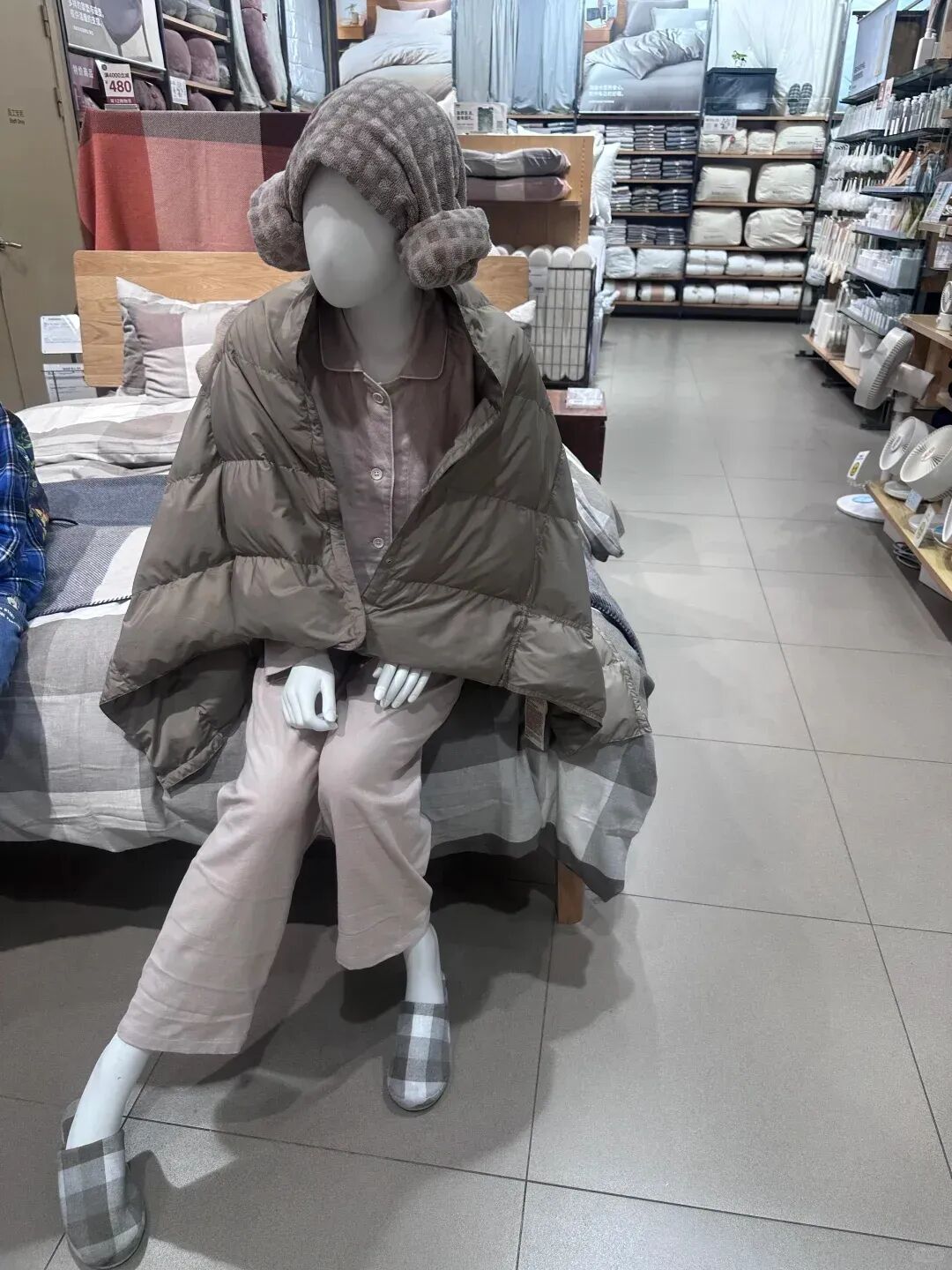 精准踩中情绪痛点。当代年轻人的核心情绪是什么?是压力、焦虑、内耗、疲惫,是渴望“松弛感”却又不得不“硬扛”,是想“摆烂”却又不敢“躺平”。无印良品的模特,完美复刻了这些状态:披着外套对着电脑发呆的“职场牛马”、裹着被子缩成一团的“体寒奶奶”、躺在地上手捂肚子的“痛经滚下床の神还原”。网友锐评:“有一种平静的疯感,完美演我精神状态。”