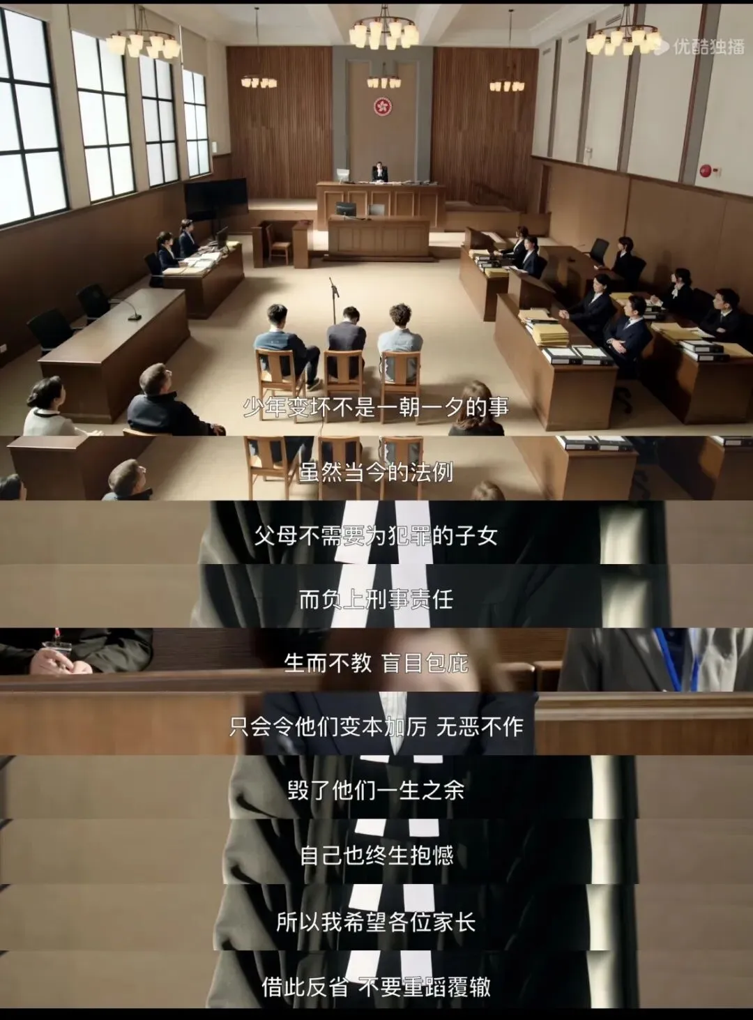现实社会中,很多少年犯的背后,都站着失职的父母。这些父母,有的对孩子疏于管教,有的对孩子一味纵容。对这类父母,《正义女神》中有一句话说得振聋发聩:“既然父母不教,就由法庭帮你教。”