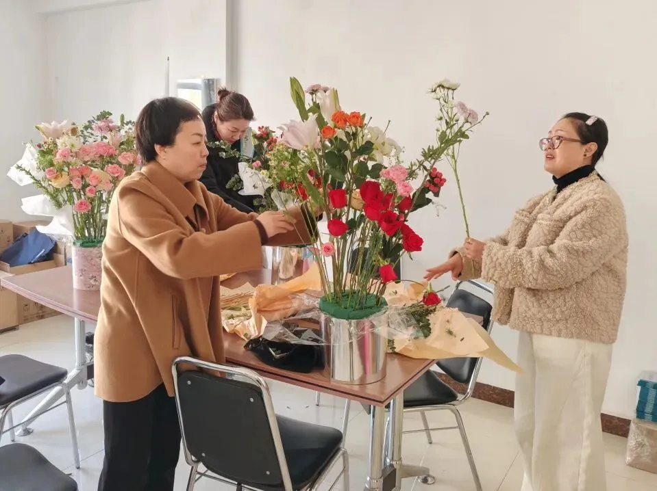 插花活动现场花香四溢、氛围浪漫。花艺老师现场示范技巧,讲解色彩搭配、层次构图与养护知识。女职工们兴致盎然,精心挑选玫瑰、康乃馨、洋桔梗等鲜花,修枝剪叶、错落搭配,用巧手赋予花草诗意生机。大家手捧花束合影留念,笑意盈盈,在芬芳中慢享温馨时光。