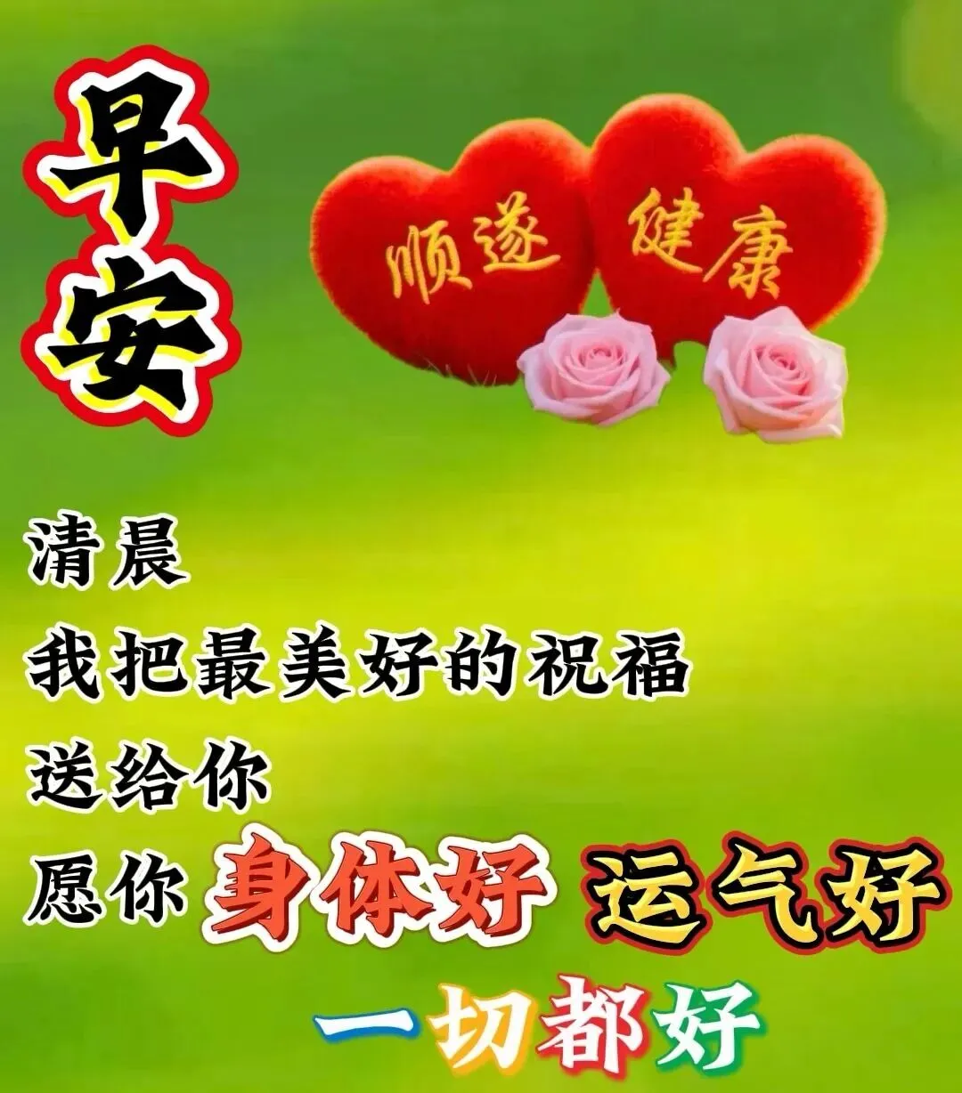朝霞满天喜洋洋,平安健康日月长,祝福送到你身旁,甜蜜日子同分享,喜乐笑容挂脸上,晨风送福好运扬。早上好!🌹,🙏🌸❤️🍻🎉