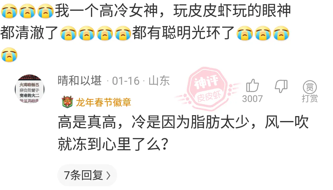 神回复:我一个高冷女神,玩皮皮虾玩的眼神都清澈了都有聪明光环了