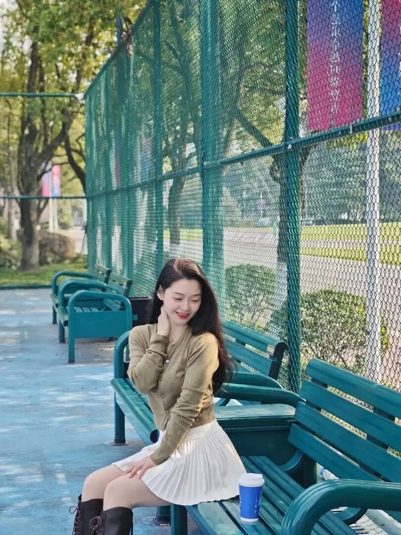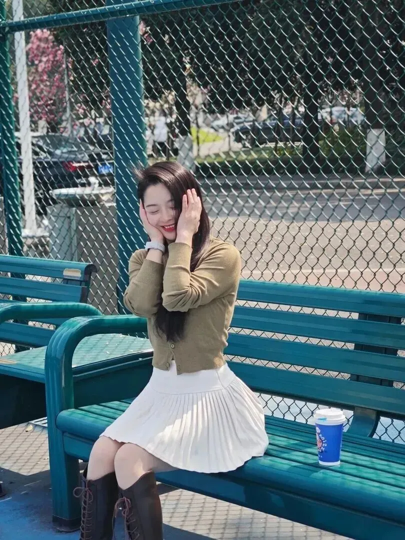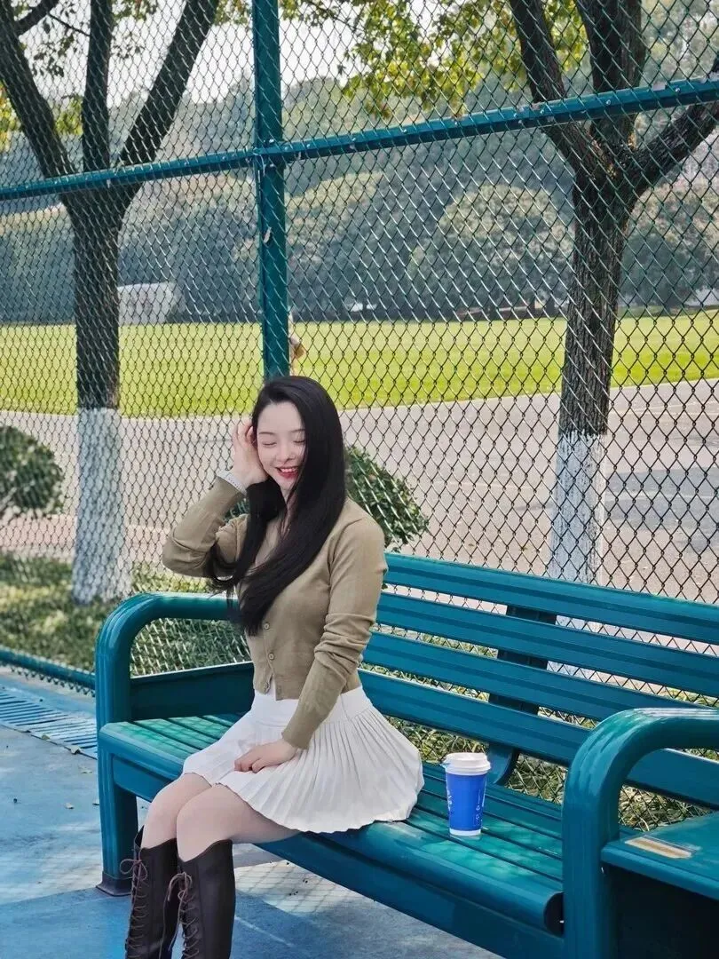 图中的女孩坐在公园长椅上非常悠然地坐了下来。阳光透过树叶落在她黑发上的感觉很暖和。头戴白色圆边帽,身穿黑色围巾、棕色长筒靴的姑娘。朴素中带有有一点奢侈。搭配之后让人一看就觉得春天就应该这样穿!