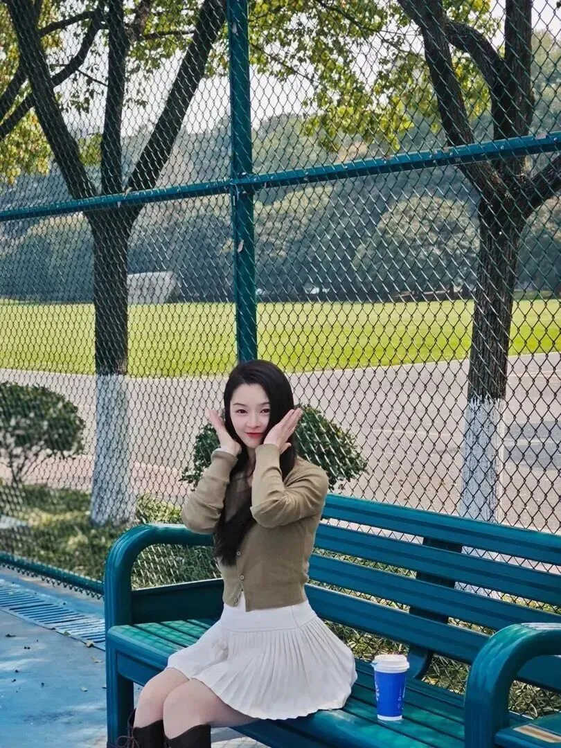 她的妆容很加分,淡淡的几乎看不出来,但眉眼都很有神。右手搭在脖子上,自然、舒服。针织衫V领设计不露太多,可以修饰脖子线条,给人轻盈之感。