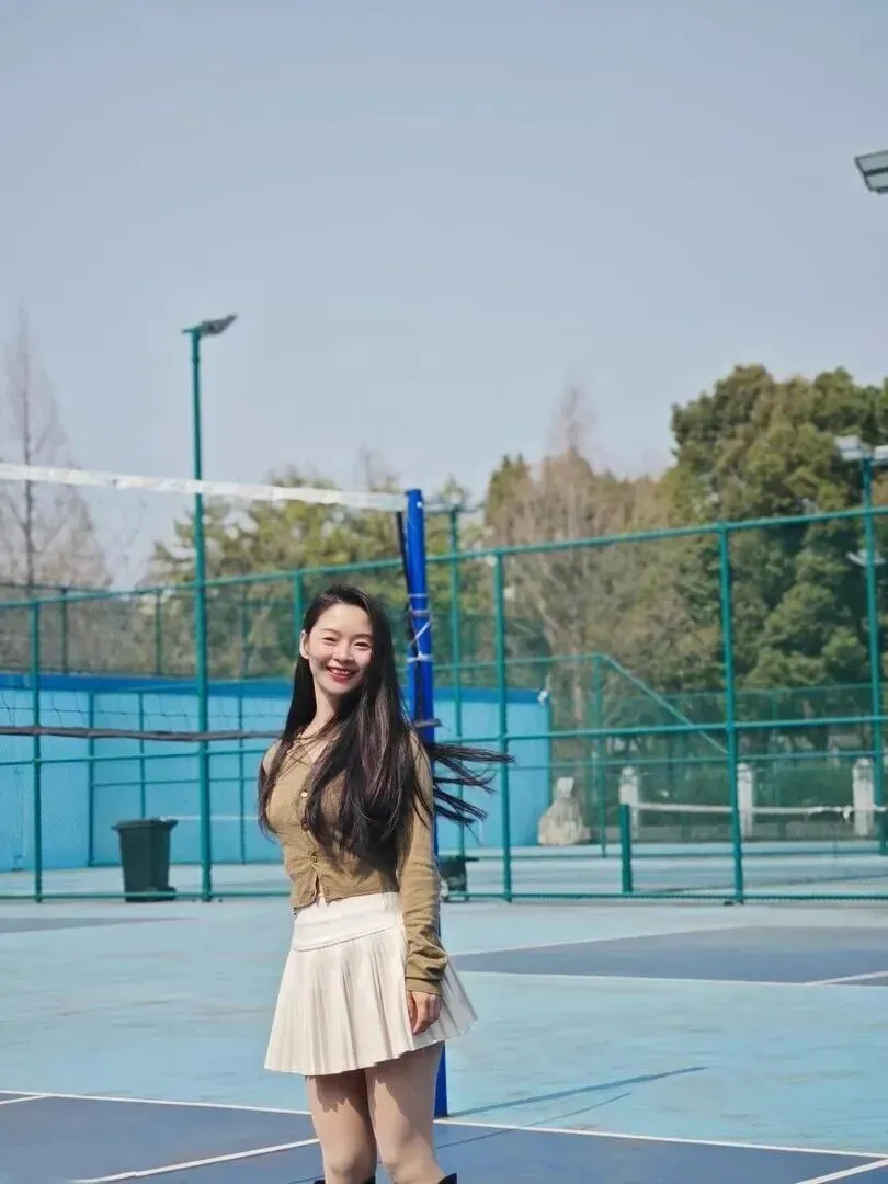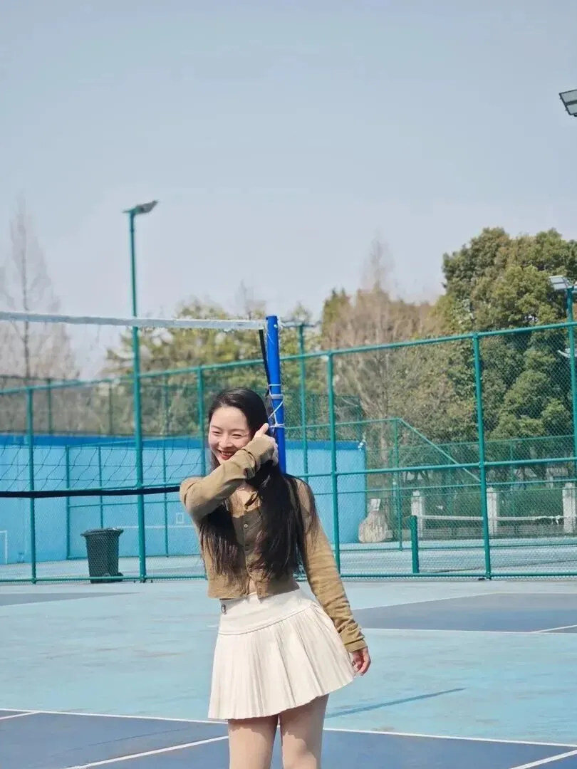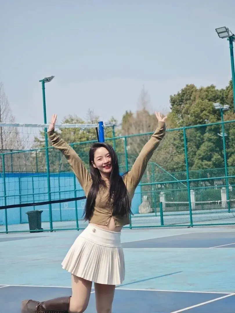 就算是在运动场里,这一身衣服也是十分夺目的。她站在蓝色、白色的塑胶地上,后面有绿色的球网,人看上去非常活泼。黑色高筒靴给整体添加了另外一部分,不给整体添太多冷峻感。