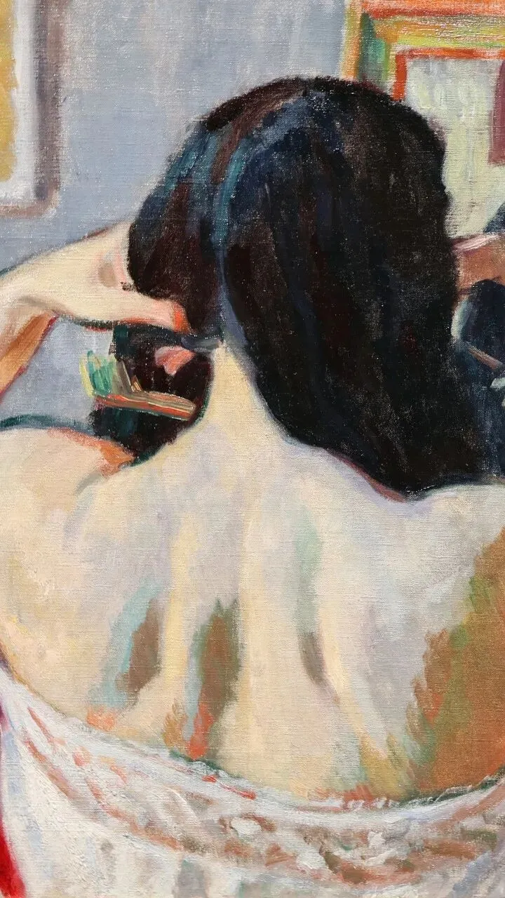 他在画中刻意弱化了线条的束缚,让色彩本身去定义形体,让光线去讲述故事。庞凯维奇的画风在这一时期已经完全脱离了早期的阴郁,转向了对明亮色彩的欢歌。在这种色彩的交响中,艺术家完成了从肉眼观察到心灵表达的跨越,将一个平凡的梳妆瞬间定格成了永恒的艺术经典。