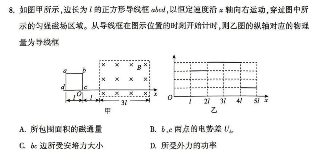 首先是选择题第8题,线框在磁场中的运动,老朋友了,但是看一下问题,傻眼了:没有纵坐标,要判断纵坐标!