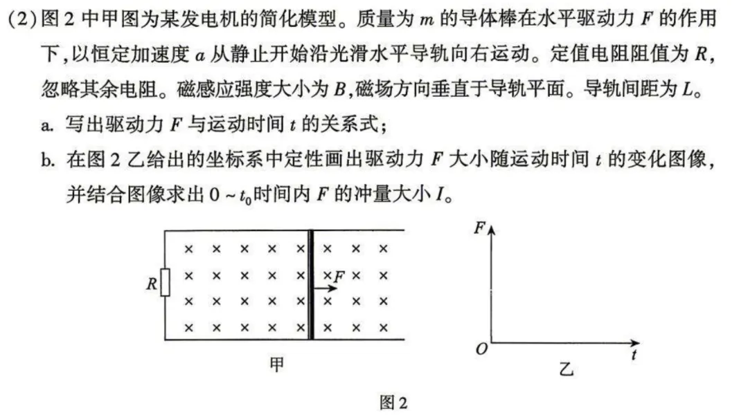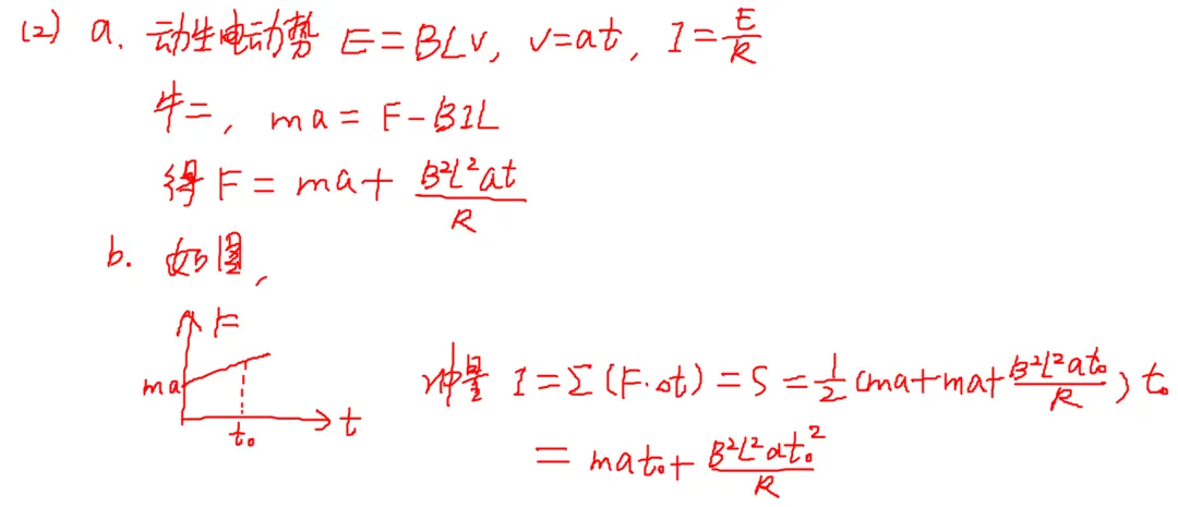 第二问,电磁感应常规操作求出F的表达式,再结合F-t图像的面积含义(冲量)即可解出,难度与第一问差不多,只是计算稍微繁琐一点: