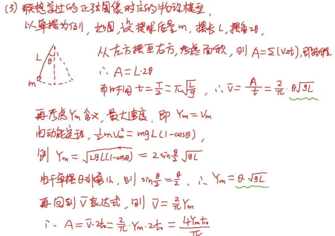 下面是难点了,纵坐标Ym还没用呢,物理含义也就是速度最大值,即单摆最低点速度,用一下动能定理吧,再导一导三角函数,再利用单摆的几何特性,摆角很小,其正弦值=角的大小,将Ym化简(绿色划线处)。最后联立平均速度的表达式,得出结论。具体过程如下: