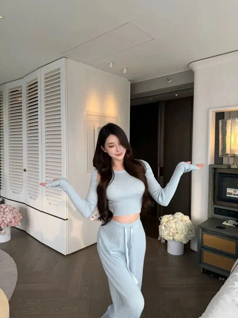 居家穿搭最忌讳邋遢,这套绝对不会的。长发微卷,笑起来暖暖的,是用针织料制成的。短上衣显腰细,温柔又带点小性感。温馨的卧室一眼望到底就变成治愈一切的方式。