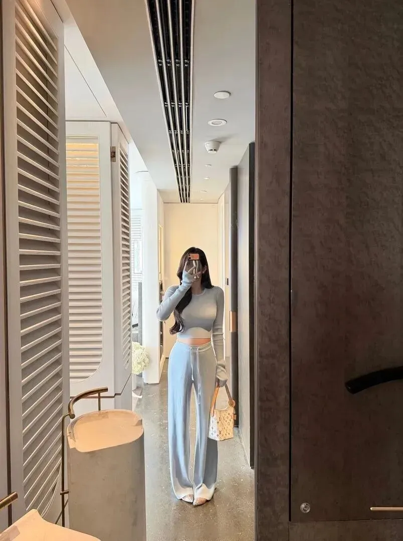 雾霾蓝的颜色太柔和了。扎个低马尾,妆容清淡些,整个人就变柔顺了。针织面料贴着身,腰那里稍微露出一些,不会太过张扬。穿法更适合于上学、上班,虽然看上去很规矩,但又带有一点小性感。