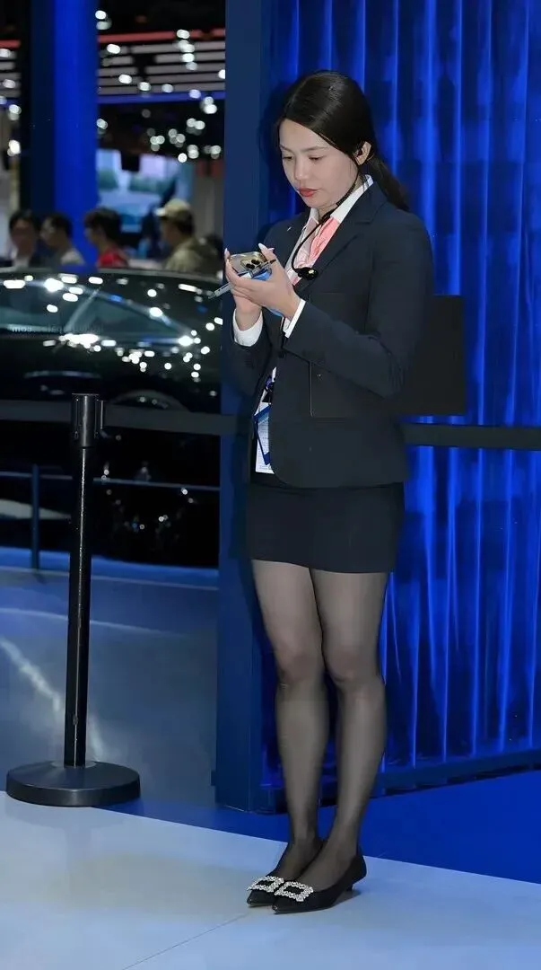 放松点的展会造型也很好。西装套装没有内搭白衬衣、淡粉色领结、齐臀短裙。她低头看手机的时候目光很集中。工作牌别在胸口,单手提着手机,背景是隔离带,但是她并不受影响。