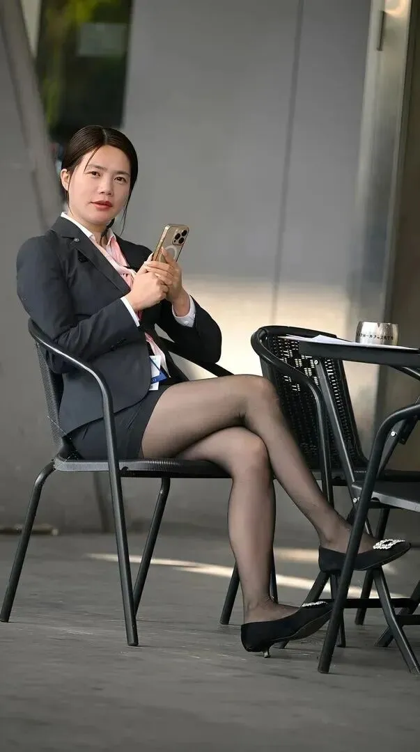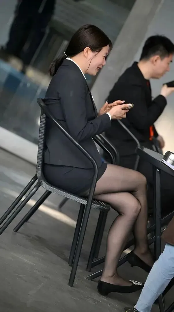 第二套更厉害。外面是深灰色的西装,里面穿着一件浅粉色的衬衣,只是露出一点点的领口。原来严肃的西装一下子多了几分甜味儿。她的工作证上写着“女职工”,因此她属于工作人员,不是拍摄的画面。坐在黑椅子上双腿交叉,银白皮鞋。低头看手机的样子,既像是在回信息又像是在放松,这样的表现很戳人。