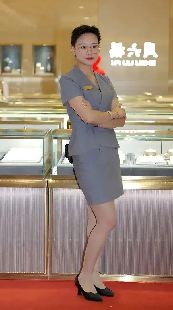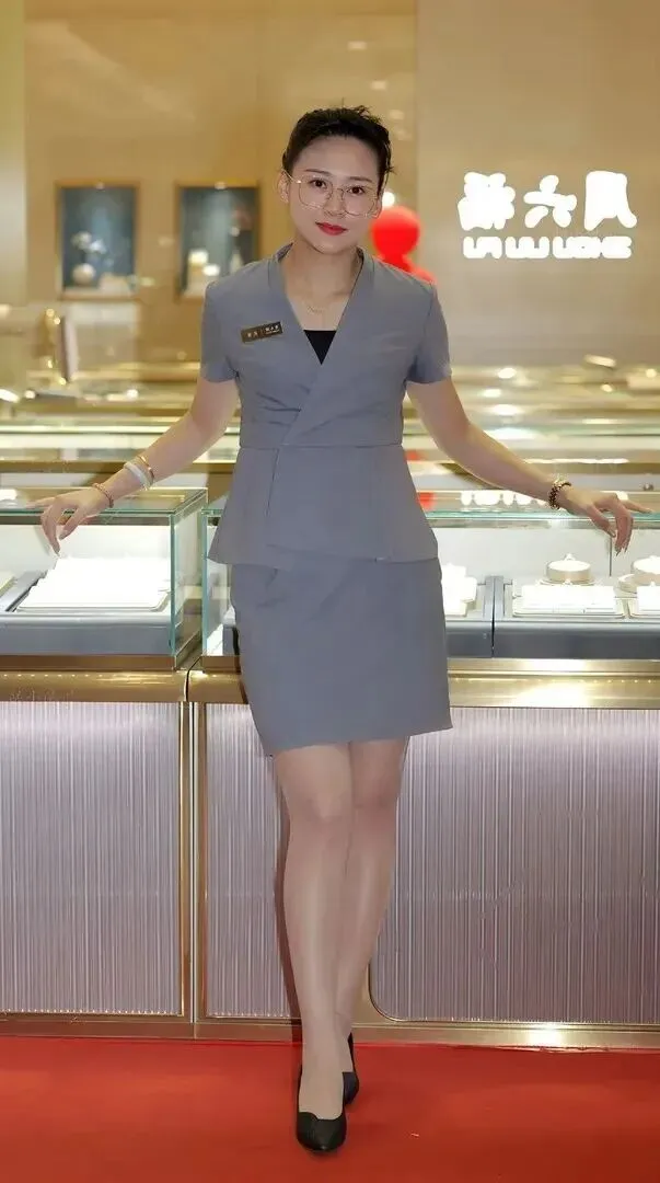 今天我们要讲的是一位在珠宝店工作的小姑娘。她穿搭简直绝了,每天上班都是走在秀场上。灯光打下来,她往那儿一站,整个人闪闪发光。浅灰职业套装剪裁合体给人以瘦但精神的感觉。她一直微笑着接待着客人,那一种自信的感觉从里面都能感受得到。