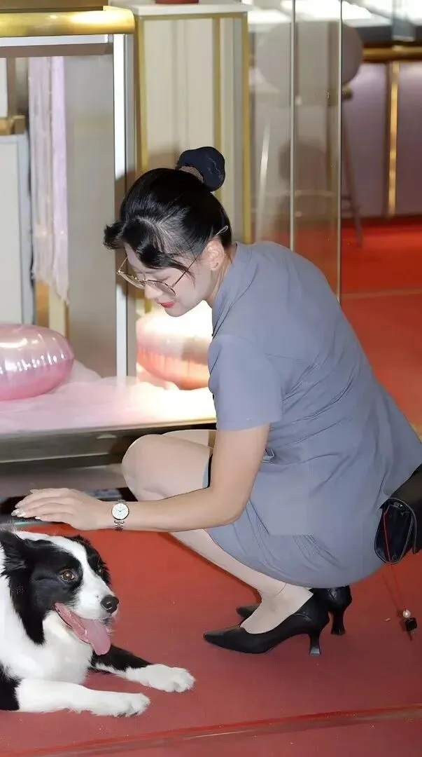有时候接待重要的客户,她会穿正式一点。手表用金属表带替换的,工牌为金色的,看上去更加正规。但是休息的时候,她就怎么舒服怎么来。深绿色的上衣加米白的阔腿裤,显得十分随便。蹲下来跟店里的边牧玩的时候,她笑得最灿烂,完全没有了上班时候的严肃。
