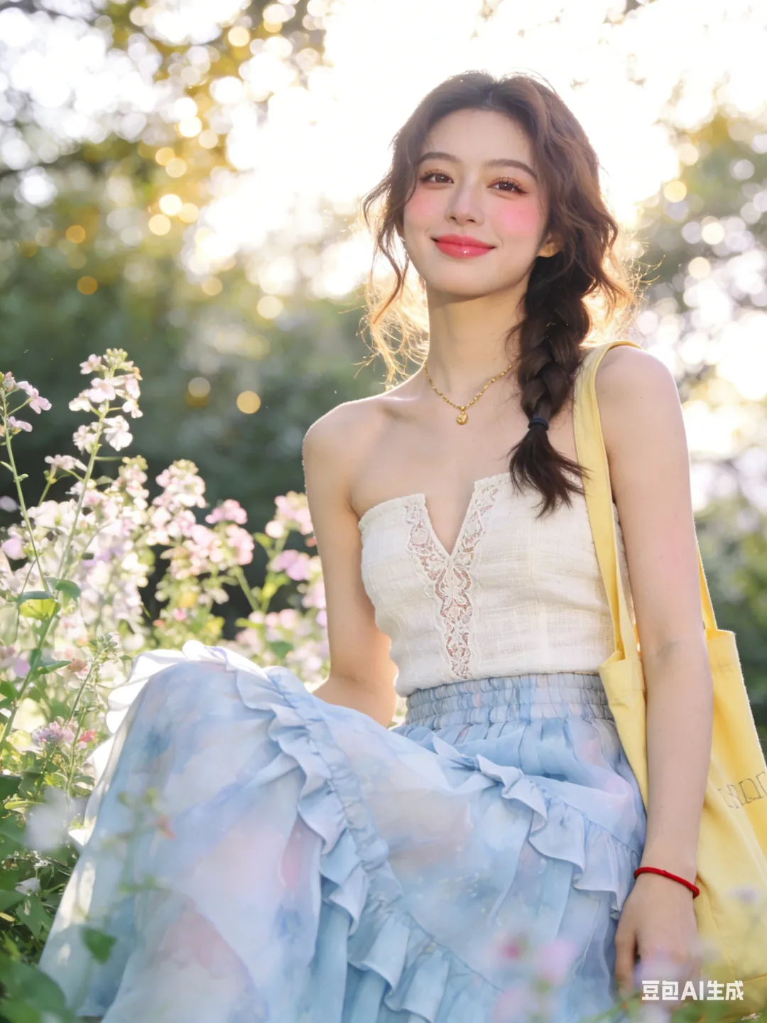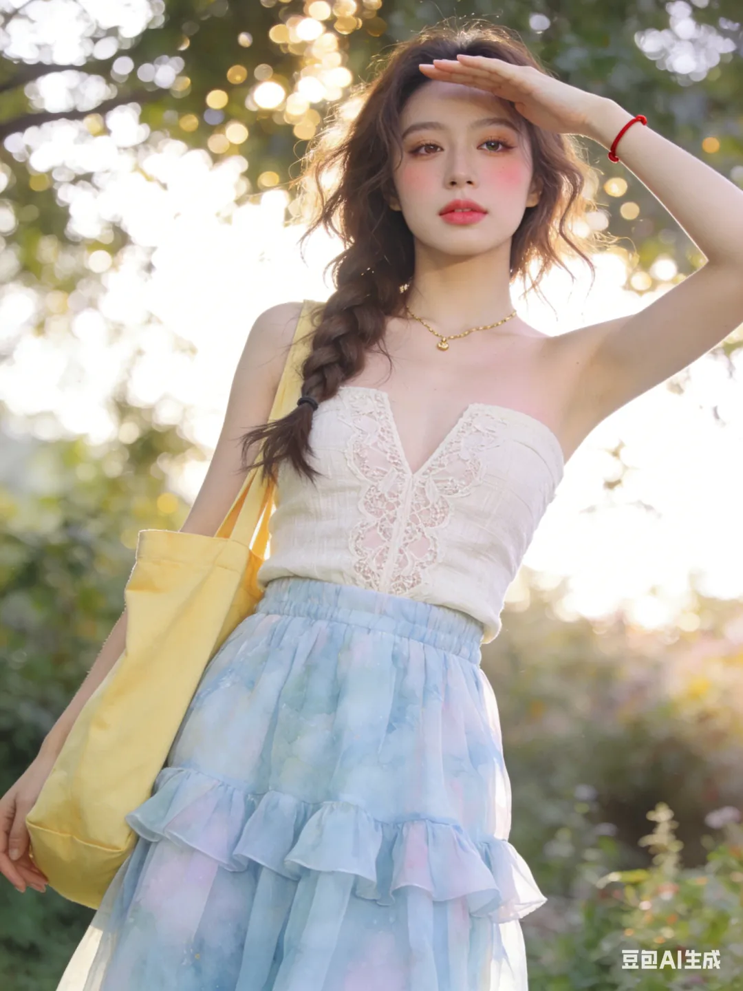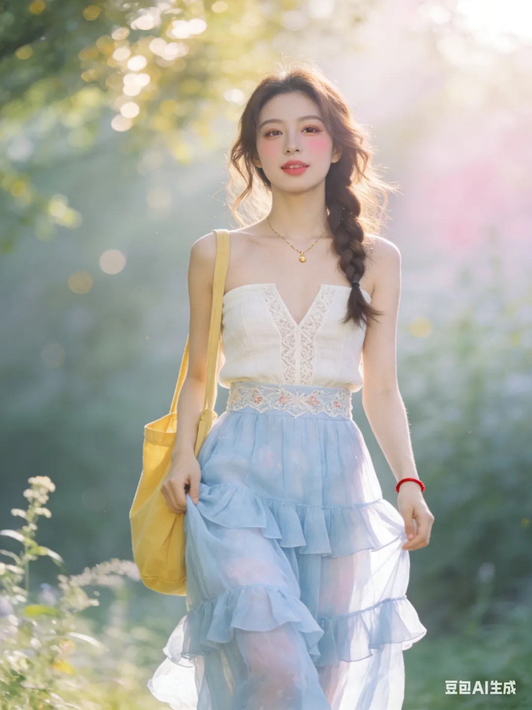 服饰妆容:米白亚麻抹胸上衣+淡蓝雪纺长裙,蕾丝刺绣V领,高腰多层荷叶边,整体飘逸仙气。伪素颜妆,自然底妆,浅棕眼影,卷翘睫毛,裸粉润唇,淡粉腮红。