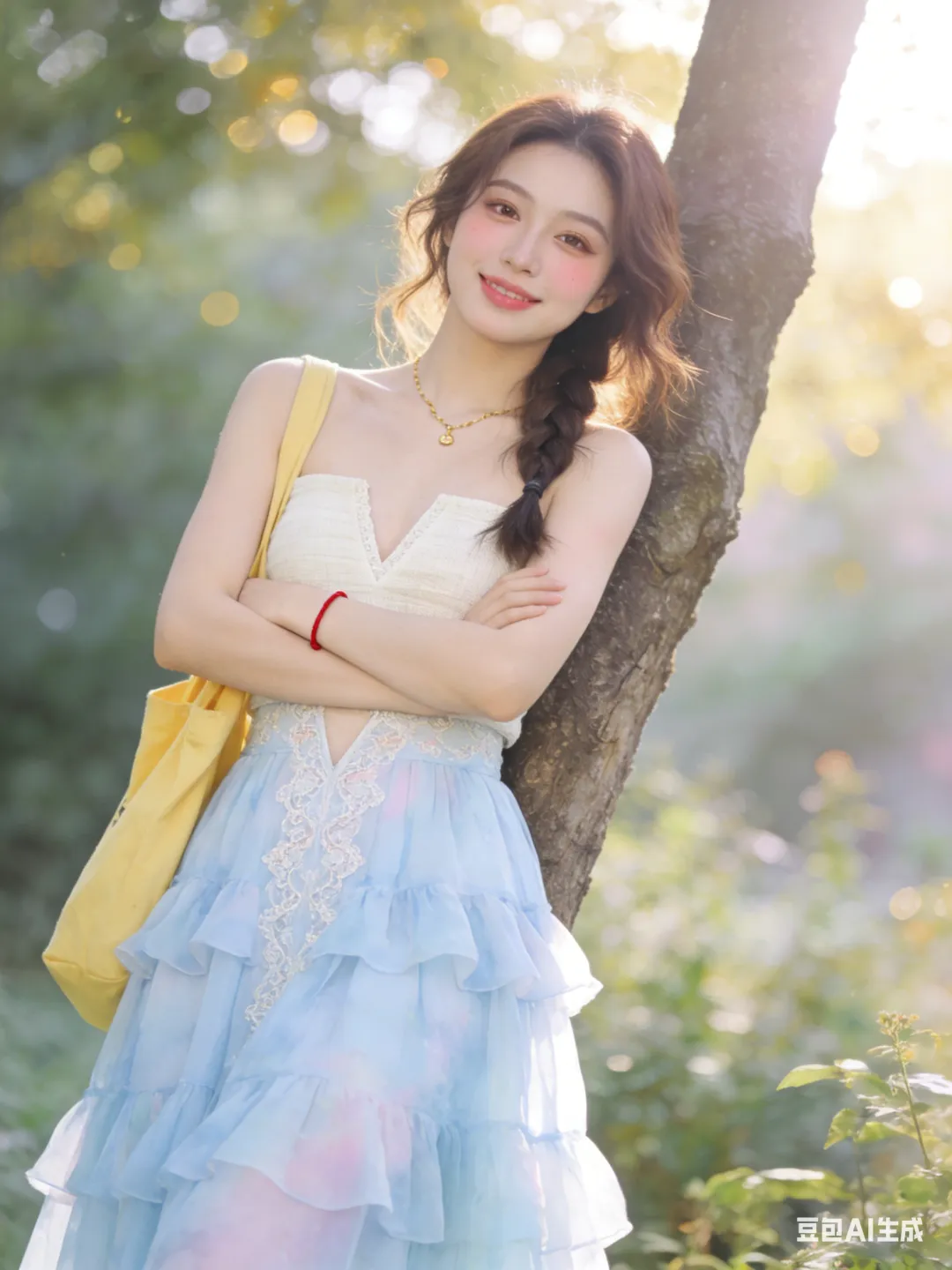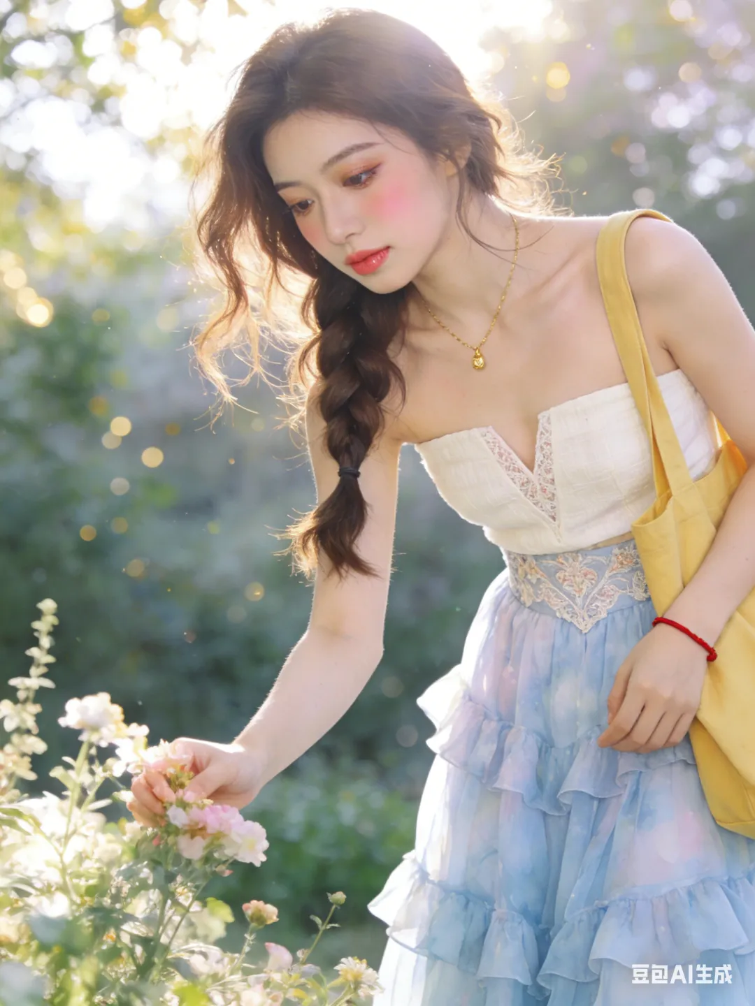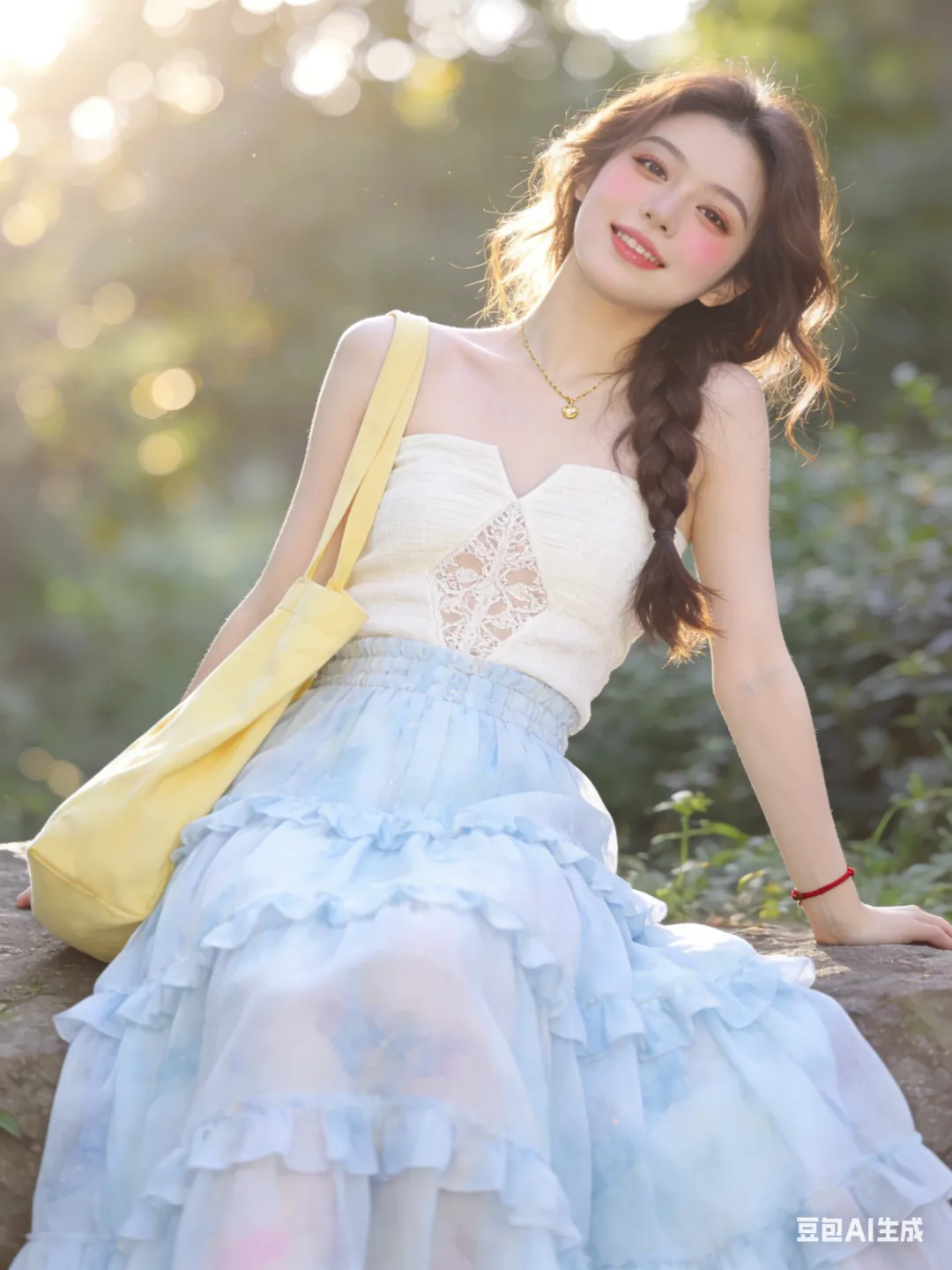服饰妆容:米白亚麻抹胸上衣+淡蓝雪纺长裙,蕾丝刺绣V领,高腰多层荷叶边,整体飘逸仙气。伪素颜妆,自然底妆,浅棕眼影,卷翘睫毛,裸粉润唇,淡粉腮红。