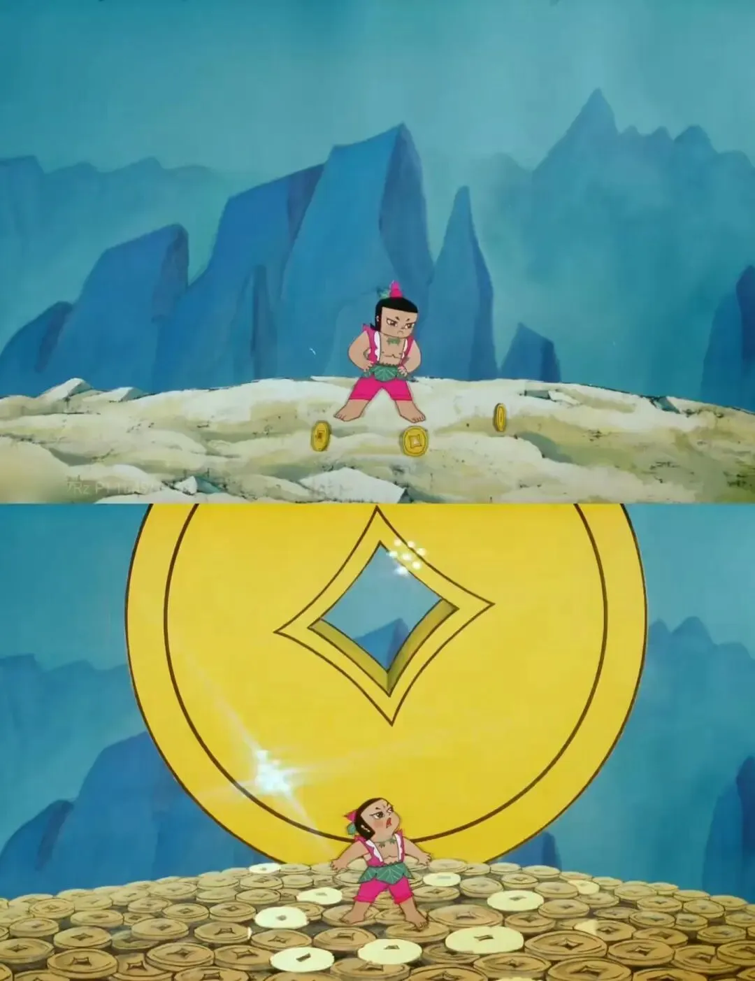接着拿出宝物“财神通”,是枚古铜币,这铜币一分为二,二分为四,四生八方,变成漫天铺地的钱币,钱币越积越多,钱眼也越变越大。