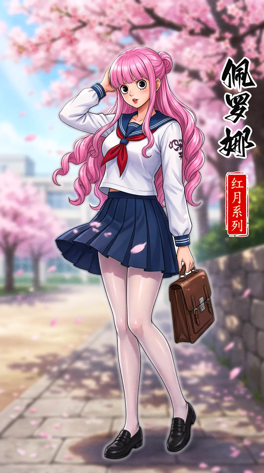 这是我们这一期的氛围感天花板! 佩罗娜换上了经典的水手领校服,粉色长发在飞舞的樱花下显得格外出众。