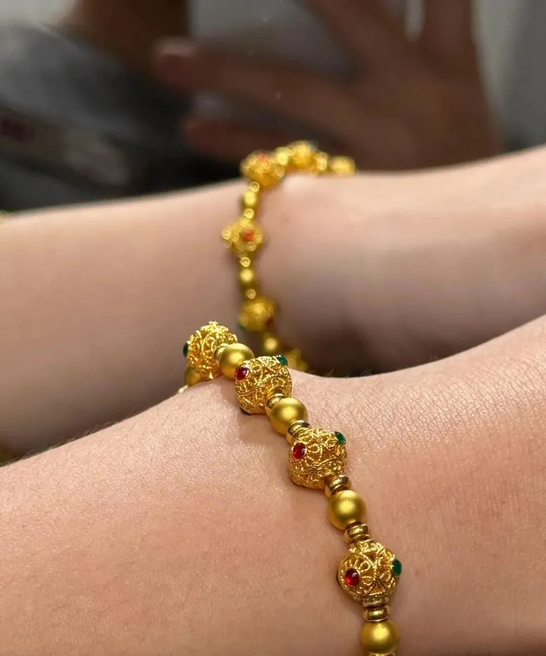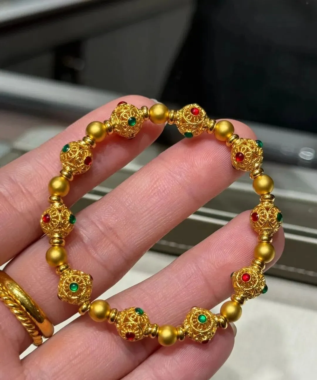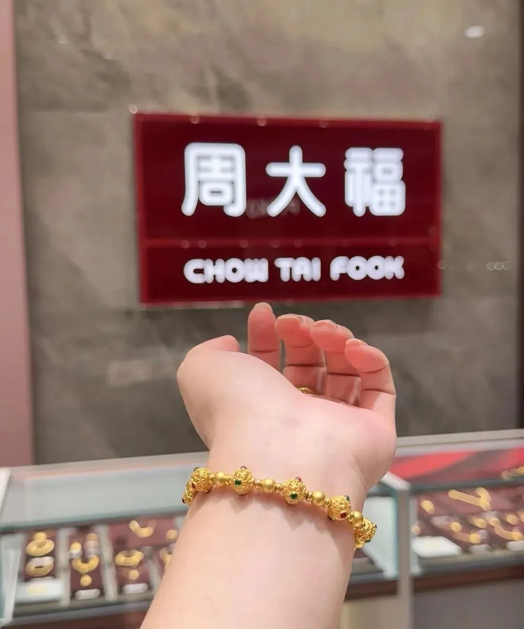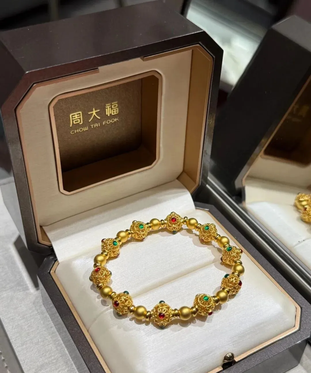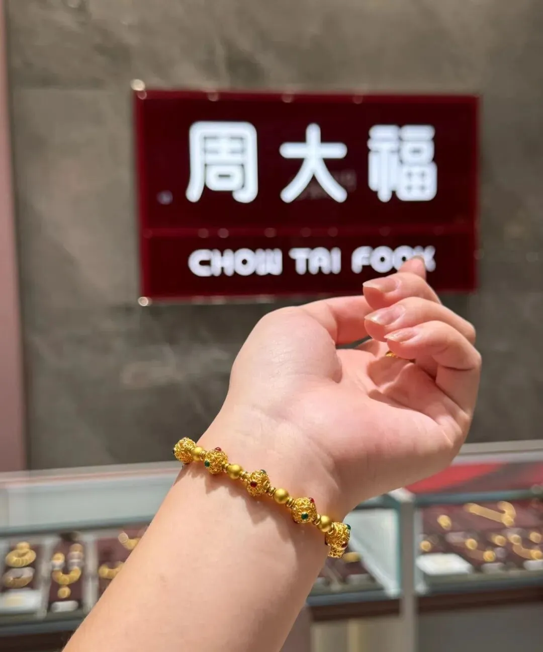 前两天路过周大福 看到橱窗里摆着一条镶彩宝的黄金手链 那个颜色搭配真的一眼就被吸引住了 红色绿色的小宝石点缀在金珠子中间 整体看上去既富贵又不会太老气 店员说这款最近卖得特别火 好多人买来送给老婆或者妈妈当女神节礼物