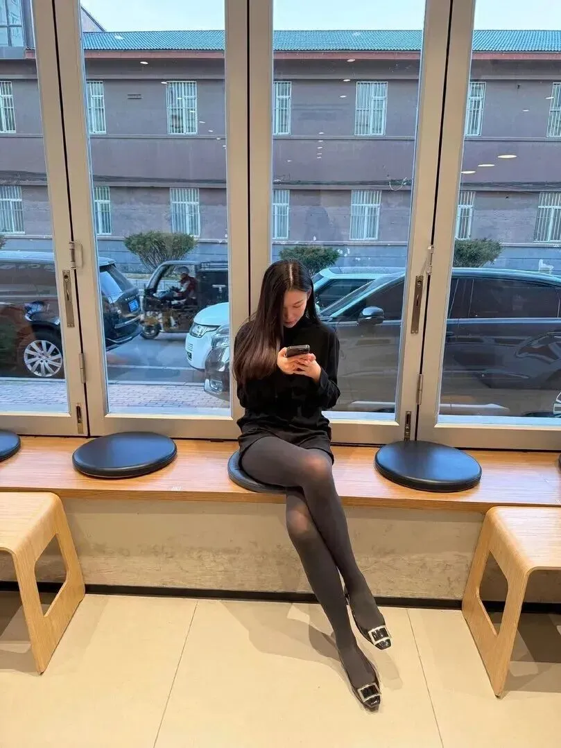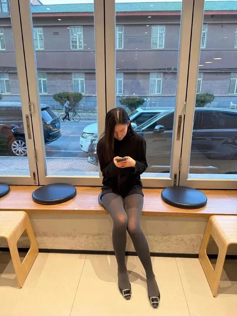 材质混搭也起着重要的作用。毛衣质感柔软,丝袜带有透光的感觉,鞋子光面。三种不同的材质碰在一起就给全黑的穿搭添了几抹亮色。