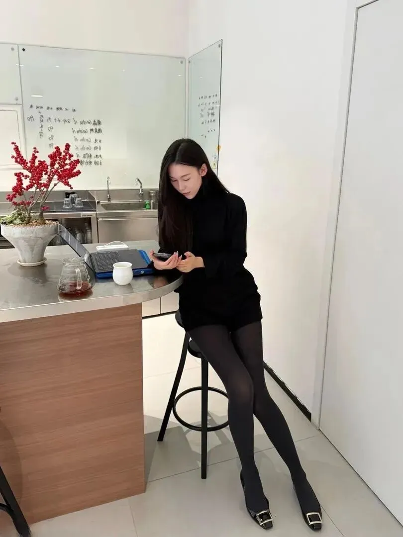 效果怎么样呢?该博主全身都是黑色的搭配,高领毛衣配短裤,丝袜配单鞋。乍一看,黑色好像把人整个包裹起来,但是没有丝毫感觉沉甸甸的。颜色统一之后视觉上拉长了线条,看起来很修长。