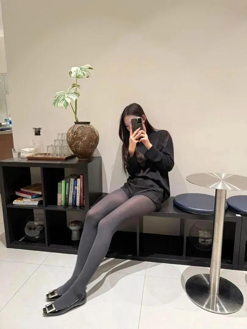 效果怎么样呢?该博主全身都是黑色的搭配,高领毛衣配短裤,丝袜配单鞋。乍一看,黑色好像把人整个包裹起来,但是没有丝毫感觉沉甸甸的。颜色统一之后视觉上拉长了线条,看起来很修长。