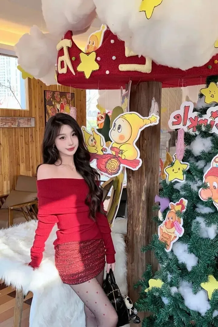 酒红色选择得非常好。它不是那种刺眼的大红,是冬天里的一杯热红酒,深沉又迷人。针织上衣的竖条纹路清晰可见,摸起来会比较有质感,露肩设计正好露出锁骨,不会太夸张,但是却有很强的女人味。配上同样的酒红色亮片短裙,在灯光下略带微光,整个人变得很精致。