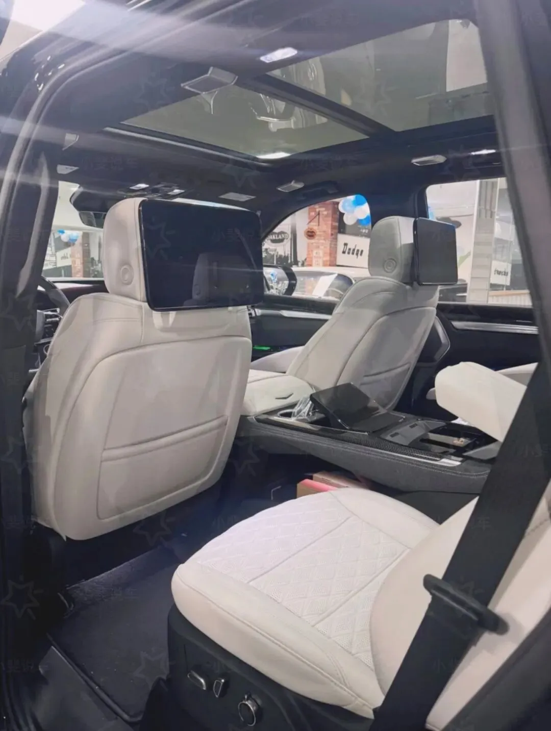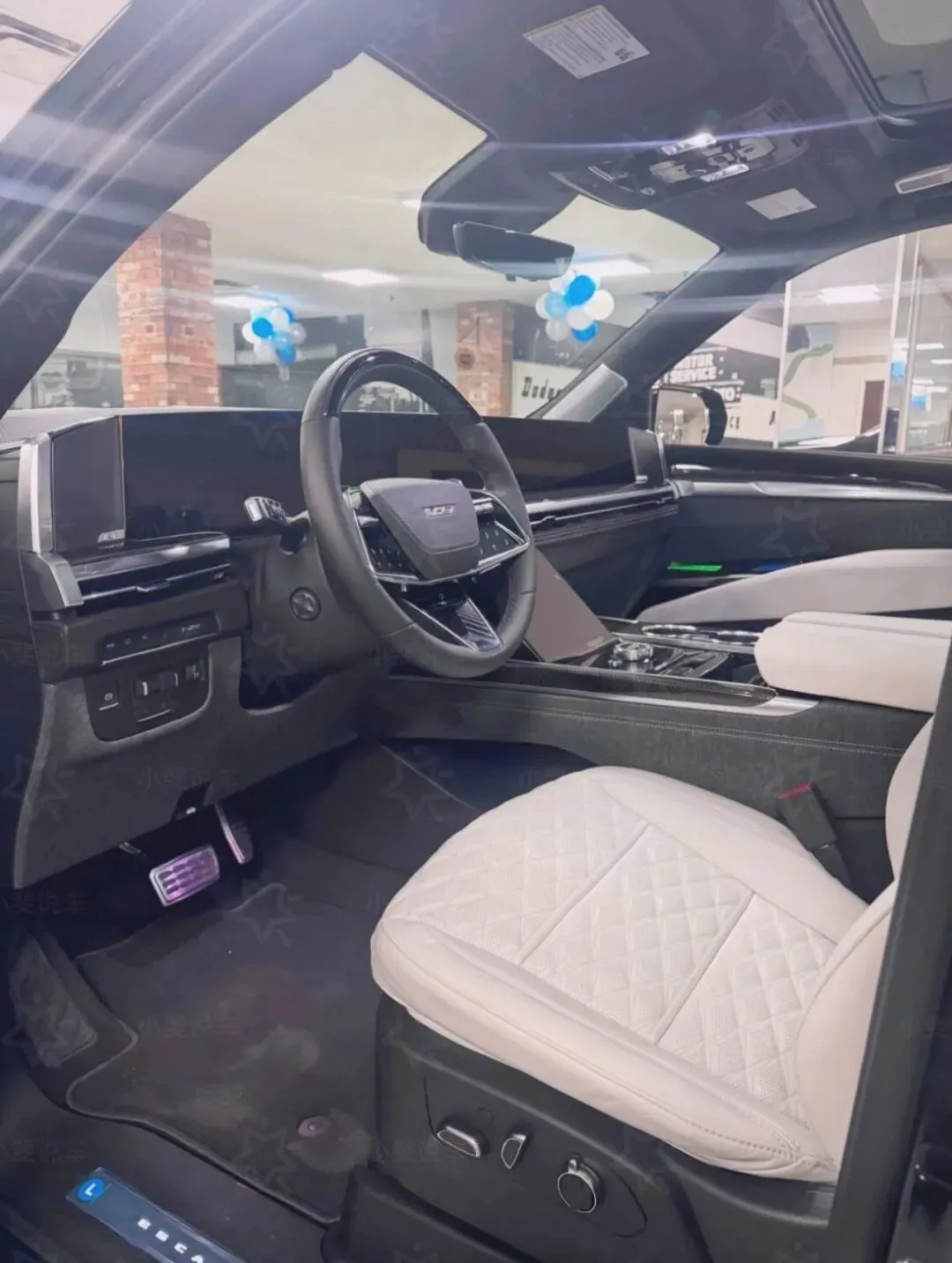 内饰更是科技与豪华尽显,55英寸全对角线曲面显示屏贯穿整个仪表台,由35英寸驾驶员显示屏和20英寸乘客显示屏无缝拼接而成,下方11英寸触摸屏负责控制空调等功能,操作便捷又具视觉冲击力。车机系统基于Android开发,内置地图、语音助手,支持苹果CarPlay和安卓Auto互联,保证了实用性与便捷性。