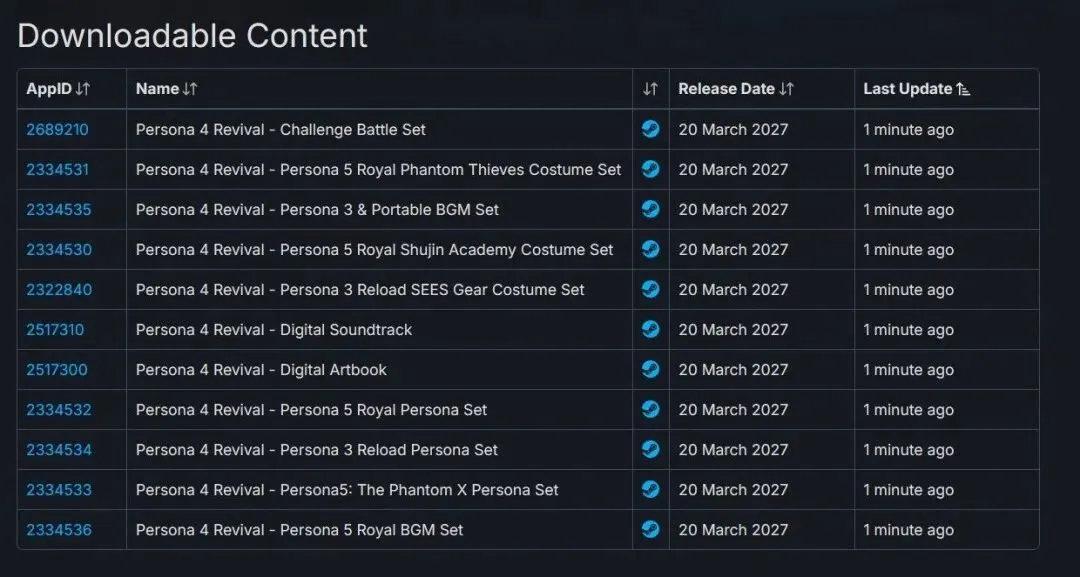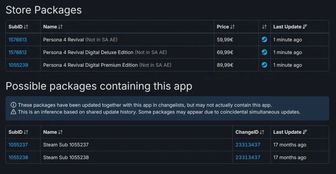 今日,有玩家在数据网站SteamDB发现关于Altus旗下备受关注的JRPG《女神异闻录4:复兴版》的元数据泄露,其中,关于本作的定价以及DLC消息都在Steam后台直接显示。