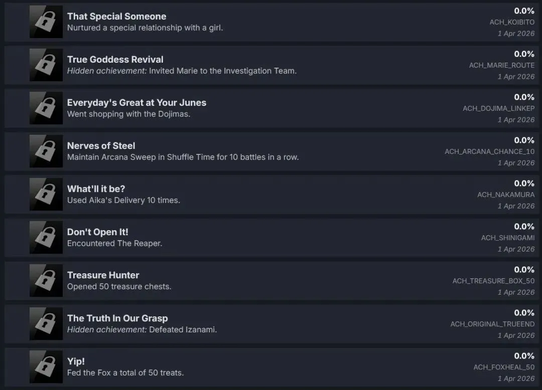 根据数据显示,《女神异闻录4:复兴版》和其他《女神异闻录》系列一样有三个版本,基础版,豪华版以及附带季票的黄金版,价格分别为59.99欧元、69.99欧元以及89.99欧元。而DLC则包括《女神异闻录5》以及《女神异闻录3》等系列其他作品的联动服装、音乐等等。此外,成就列表也一并泄露。