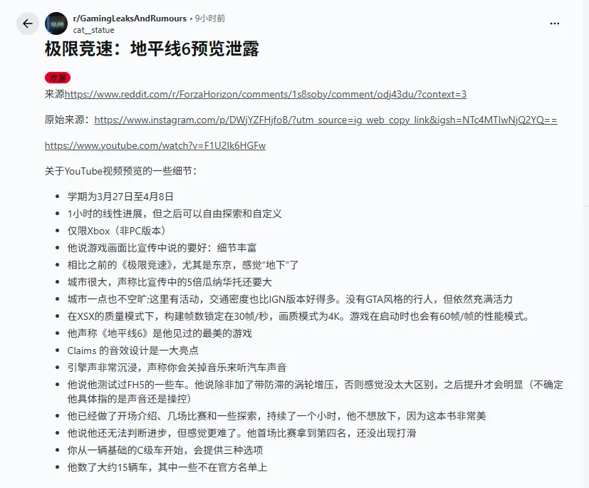 截至发稿,开发商Playground Games及发行商微软尚未就泄露内容作出官方回应。《极限竞速:地平线6》的正式发售日期尚未公布。